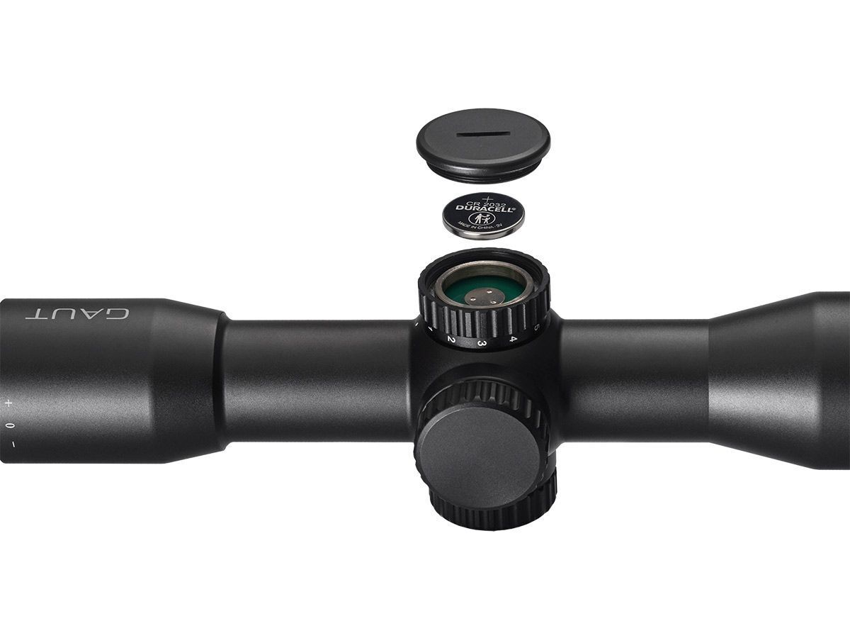 Барабанчики ввода поправок низкие и закрытые. Блок подсветки расположен в средней части прицела и работает от батарейки типа CR2032. Подсветка имеет 11 уровней, что позволяет настроить её под любые условия. Подсвечивается всё центральное перекрестие.