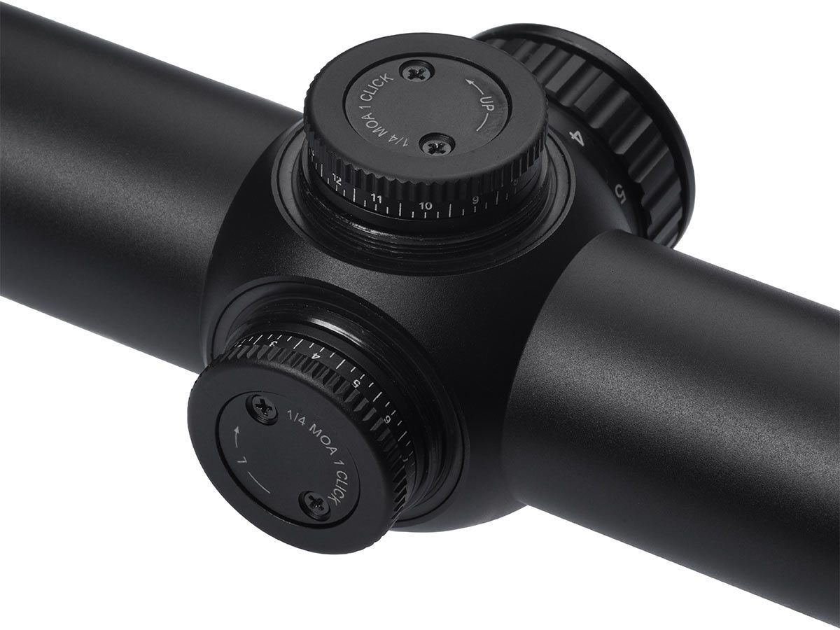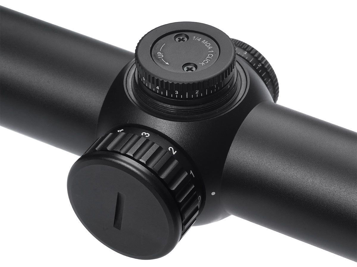 Барабанчики ввода поправок низкие и закрытые. Блок подсветки расположен в средней части прицела и работает от батарейки типа CR2032. Подсветка имеет 11 уровней, что позволяет настроить её под любые условия. Подсвечивается полностью всё центральное перекрестие.