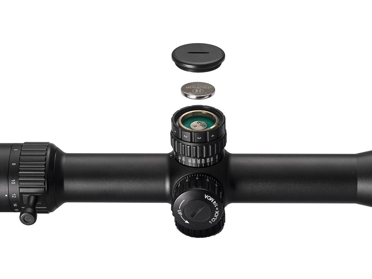 Барабанчики ввода поправок высокие и открытые. Блок подсветки расположен в средней части прицела и работает от батарейки типа CR2032. Подсветка имеет 11 уровней, что позволяет настроить её под любые условия. Подсвечивается центральная точка.