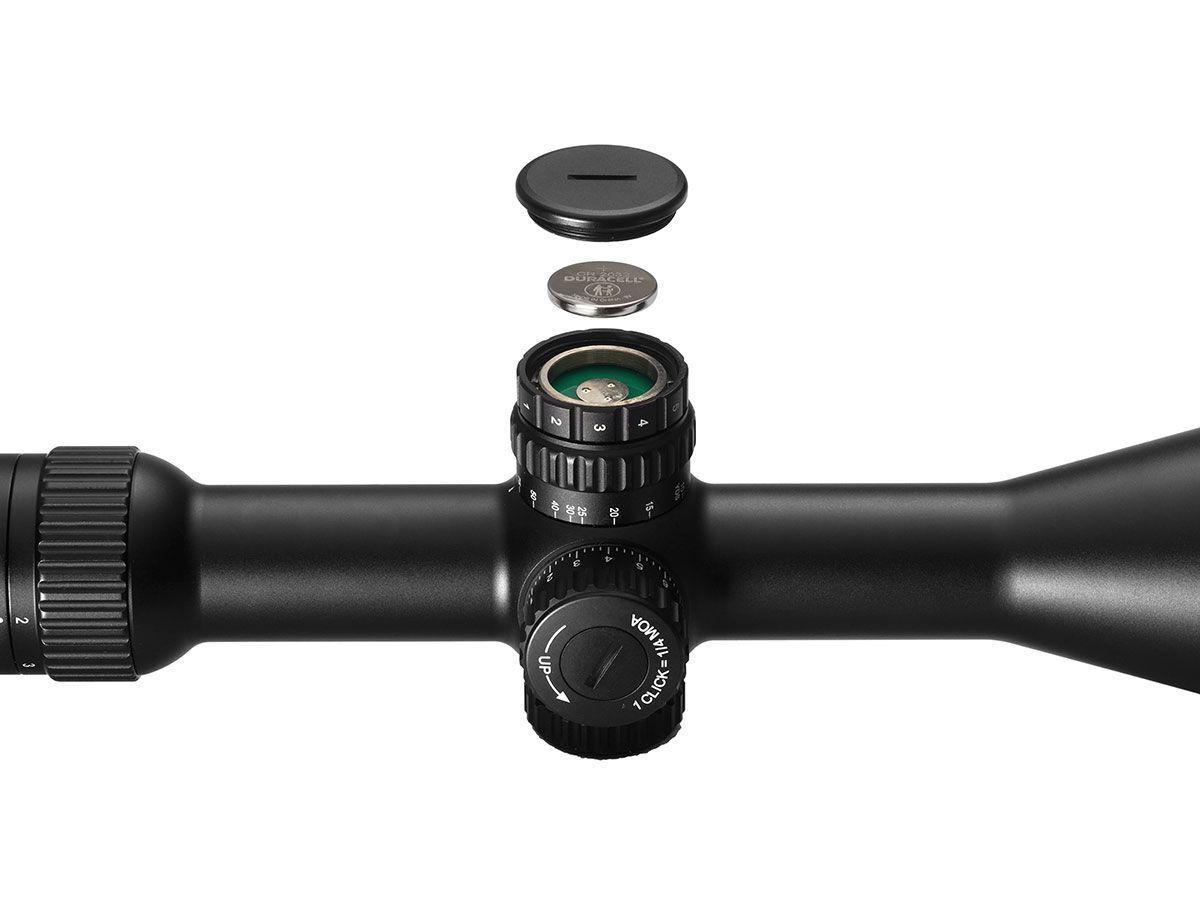 Барабанчики ввода поправок высокие и открытые. Блок подсветки расположен в средней части прицела и работает от батарейки типа CR2032. Подсветка имеет 11 уровней, что позволяет настроить её под любые условия. Подсвечивается полностью всё центральное перекрестие.