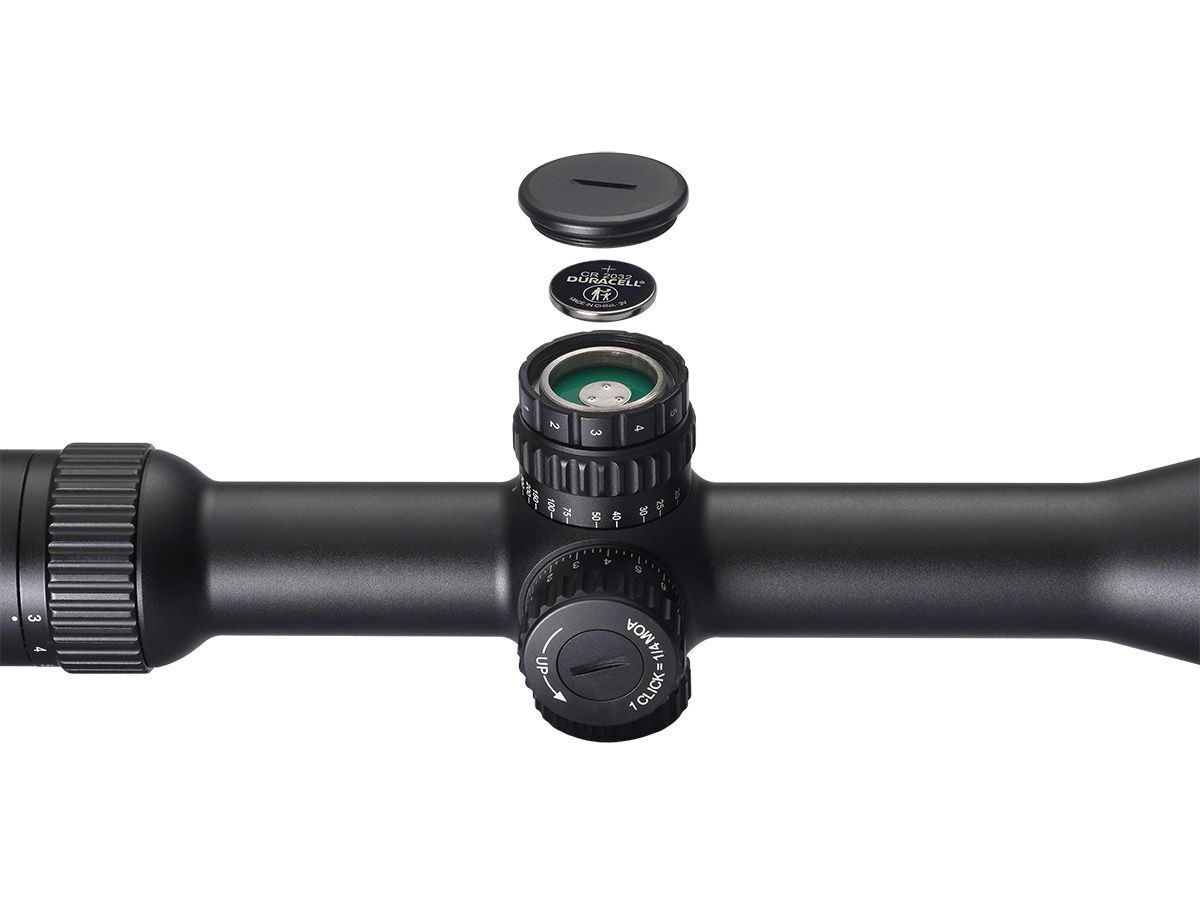 Барабанчики ввода поправок высокие и открытые. Блок подсветки расположен в средней части прицела и работает от батарейки типа CR2032. Подсветка имеет 11 уровней, что позволяет настроить её под любые условия. Подсвечивается полностью всё центральное перекрестие.