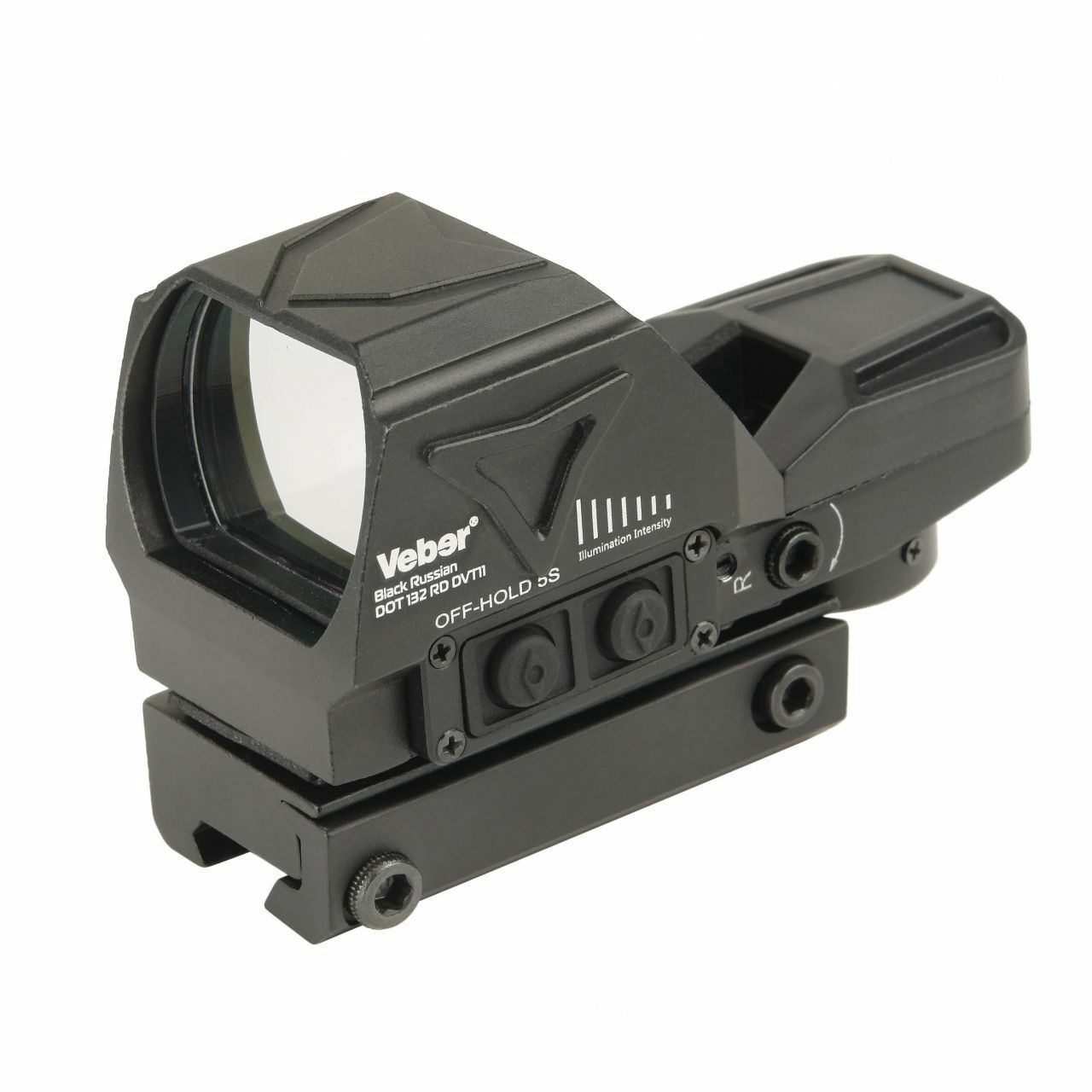 Корпус соединен с креплением для установки на планку «ласточкин хвост» 11 мм длиной от 22мм. Также выпускается модификация прицела Veber Black Russian DOT 132 RD Weaver для установки на оружие с планкой Weaver.
