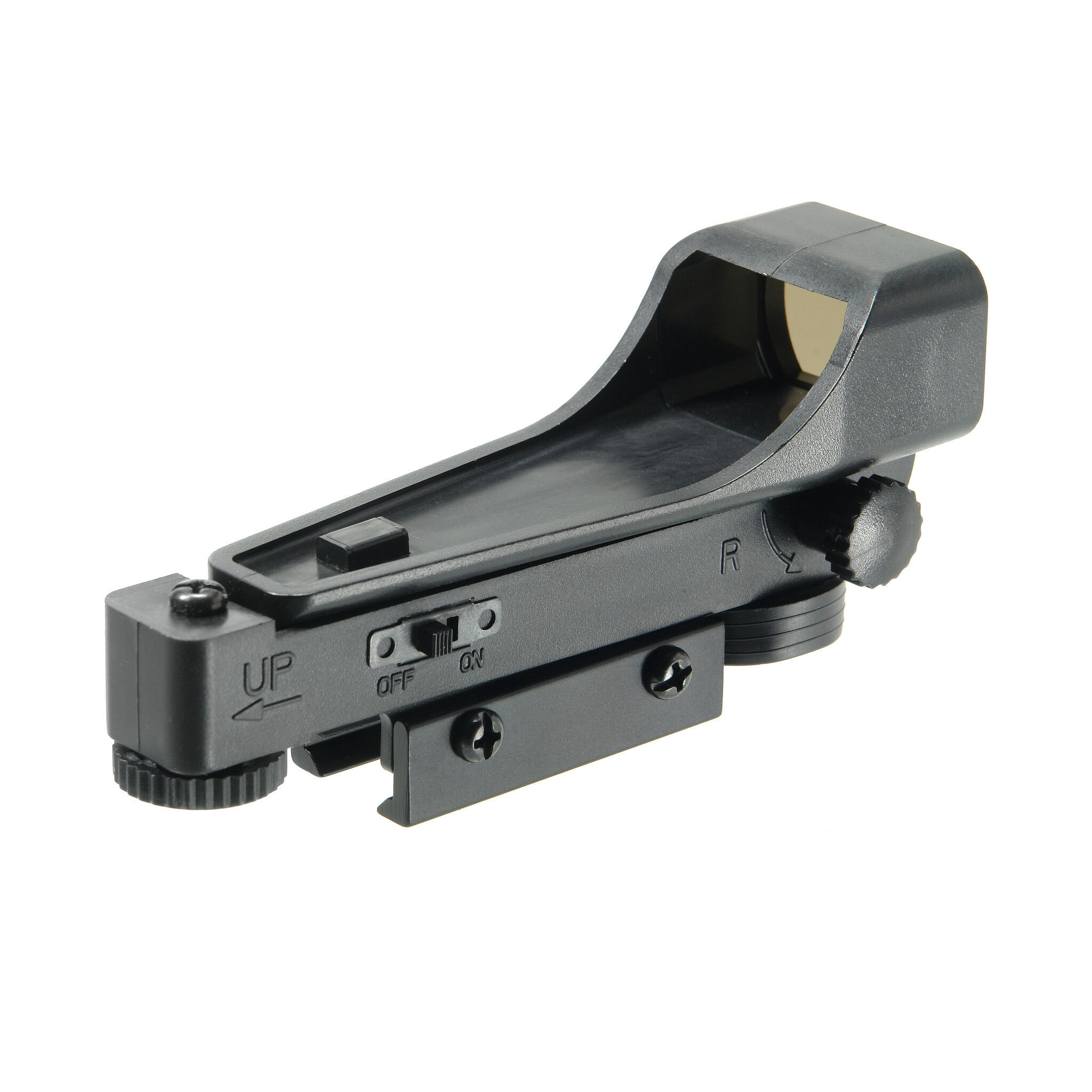 Прицел оборудован двумя винтами ввода поправок для пристрелки, двигается не точка, а вся верхняя часть прицела относительно базы. Резиновая крышка батарейного отсека под линзой выполняет дополнительную функцию амортизатора. Размер линзы — 30х20 мм, прицельная метка – подсвеченная красная точка (Red Dot).