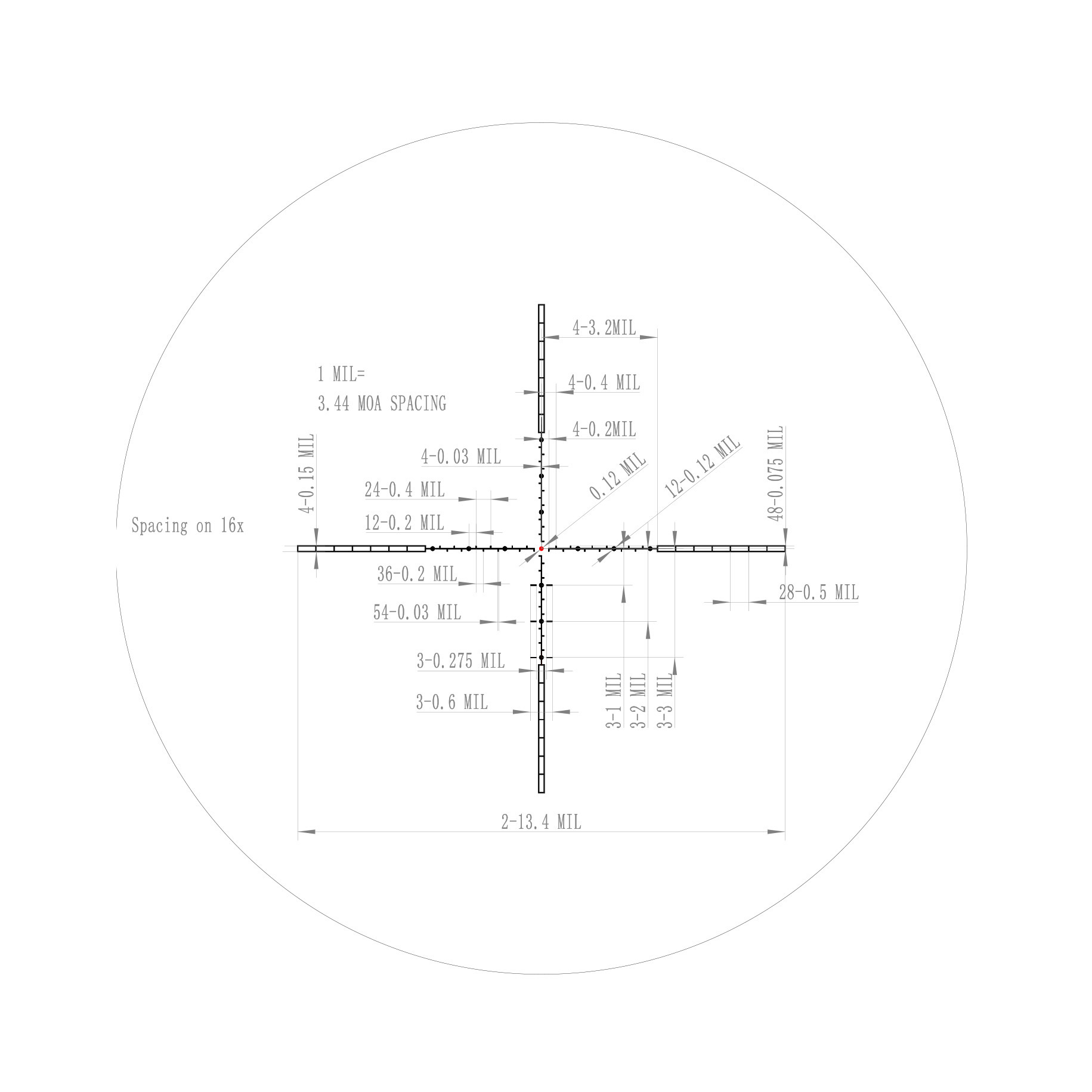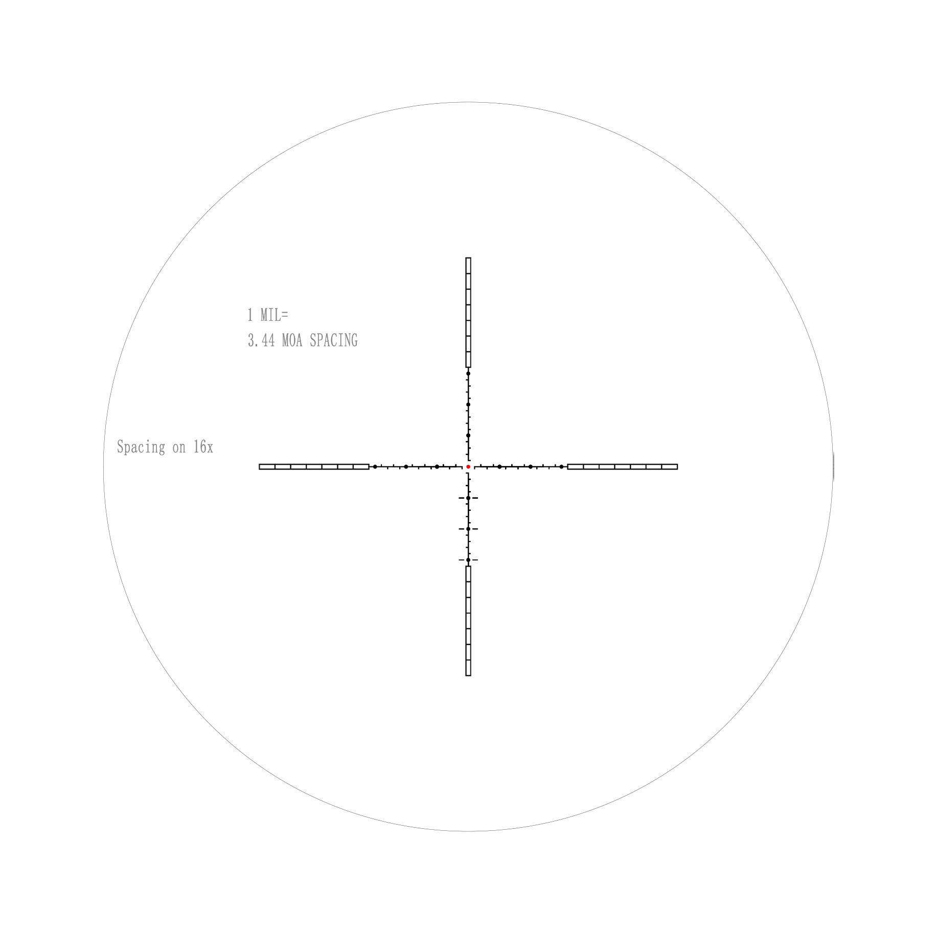 Прицельная сетка с ценой деления 1 MIL расположена во второй фокальной плоскости и вытравлена на стекле. Размер сетки в поле зрения не меняется при изменении кратности увеличения, поэтому измерения и поправки по сетке наиболее точны на максимальной кратности прицела 16х.