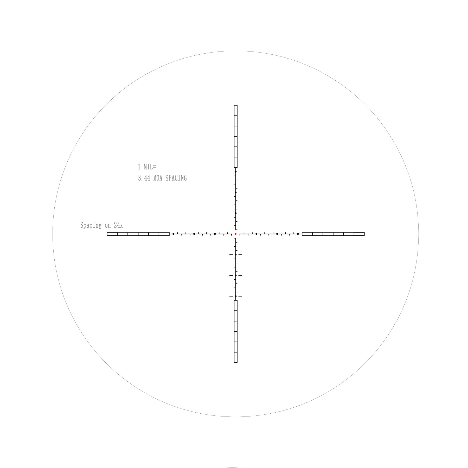 Прицельная сетка с ценой деления 1 MIL расположена во второй фокальной плоскости и вытравлена на стекле. Размер сетки в поле зрения не меняется при изменении кратности увеличения, поэтому измерения и поправки по сетке наиболее точны на максимальной кратности прицела 24х.