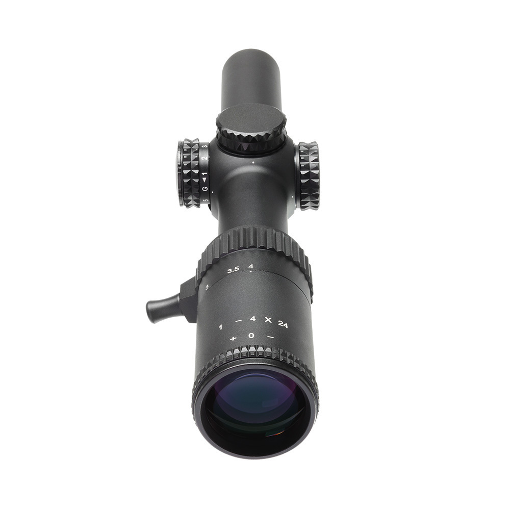 Линза объектива заглублена на целых 40 мм — ее не повредят ни ветки, ни неаккуратное обращение. 12-ти позиционный переключатель подсветки: зеленая и синяя (5 ступеней яркости) — подсвечивается только центральный кружок. Сетка изготовлена методом травления на стекле, стоит в фокальной плоскости окуляра, центральный кружок сетки можно научиться использовать для оценки расстояния до цели. Кольца диоптрийной поправки, зуммирования ходят плавно, с дозированным усилием. Фокус при смене увеличения стоит, как вкопанный.