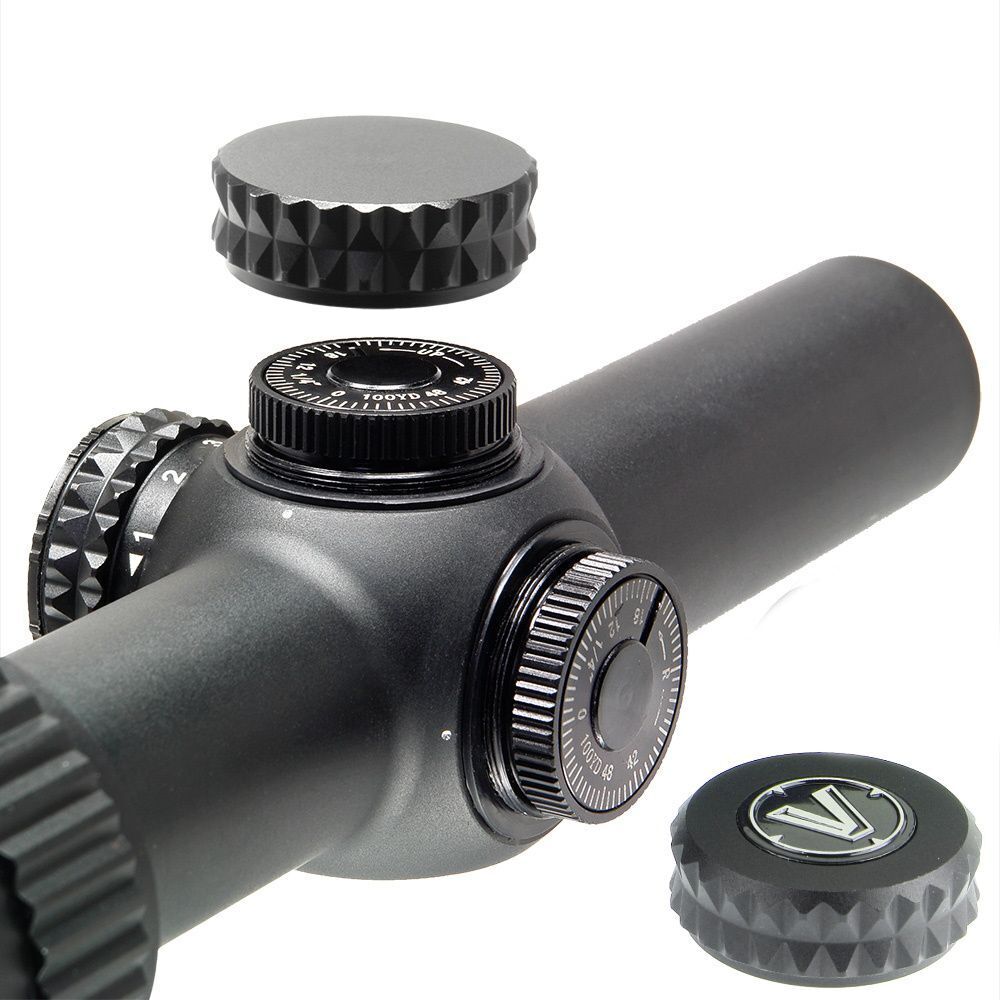 Линза объектива заглублена на 18 мм, блок подсветки расположен на окулярной части прибора. Veber Wolf 1,25-4,5*26 IR Загонник имеет сетку типа Donut Dot с двумя цветами подсветки — подсвечивается только кружок с точкой в центре перекрестья: зеленая (5 позиций переключателя) или голубая (5 позиций переключателя). Размеры прицельной сетки (см.изображения) указаны для максимального увеличения. Точный механизм ввода поправок — открытого типа (герметичный), цена деления 1/4 МОА