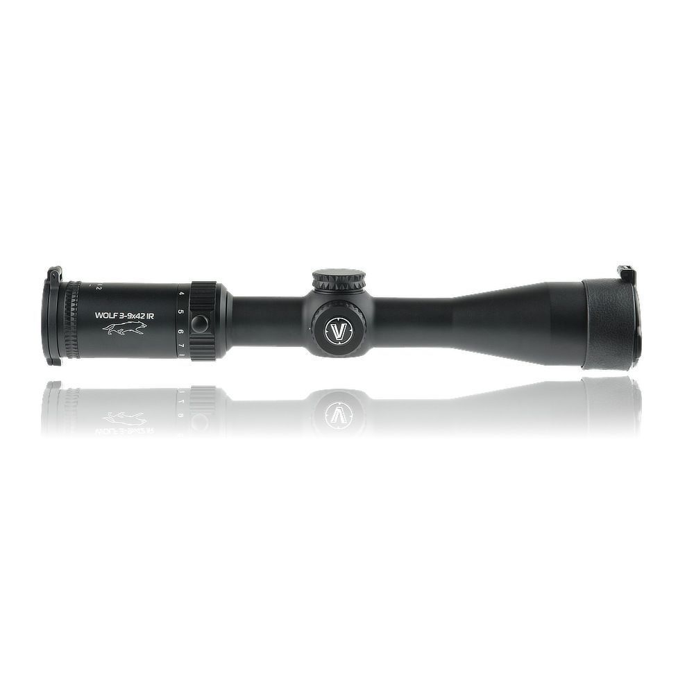 Veber Wolf 3-9x42 IR имеет сетку типа MIL-DOT с двумя цветами подсветки — зеленую и голубую, по пять ступеней яркости каждая. Сетка — в задней фокальной плоскости объектива и не меняет величину при изменении кратности. Точный механизм ввода поправок — закрытого типа, цена деления 0,25 МОА, снабжен замками фиксации барабанчиков ввода поправок после пристрелки. Имеется шкала подсчета полного числа оборотов барабанчиков.