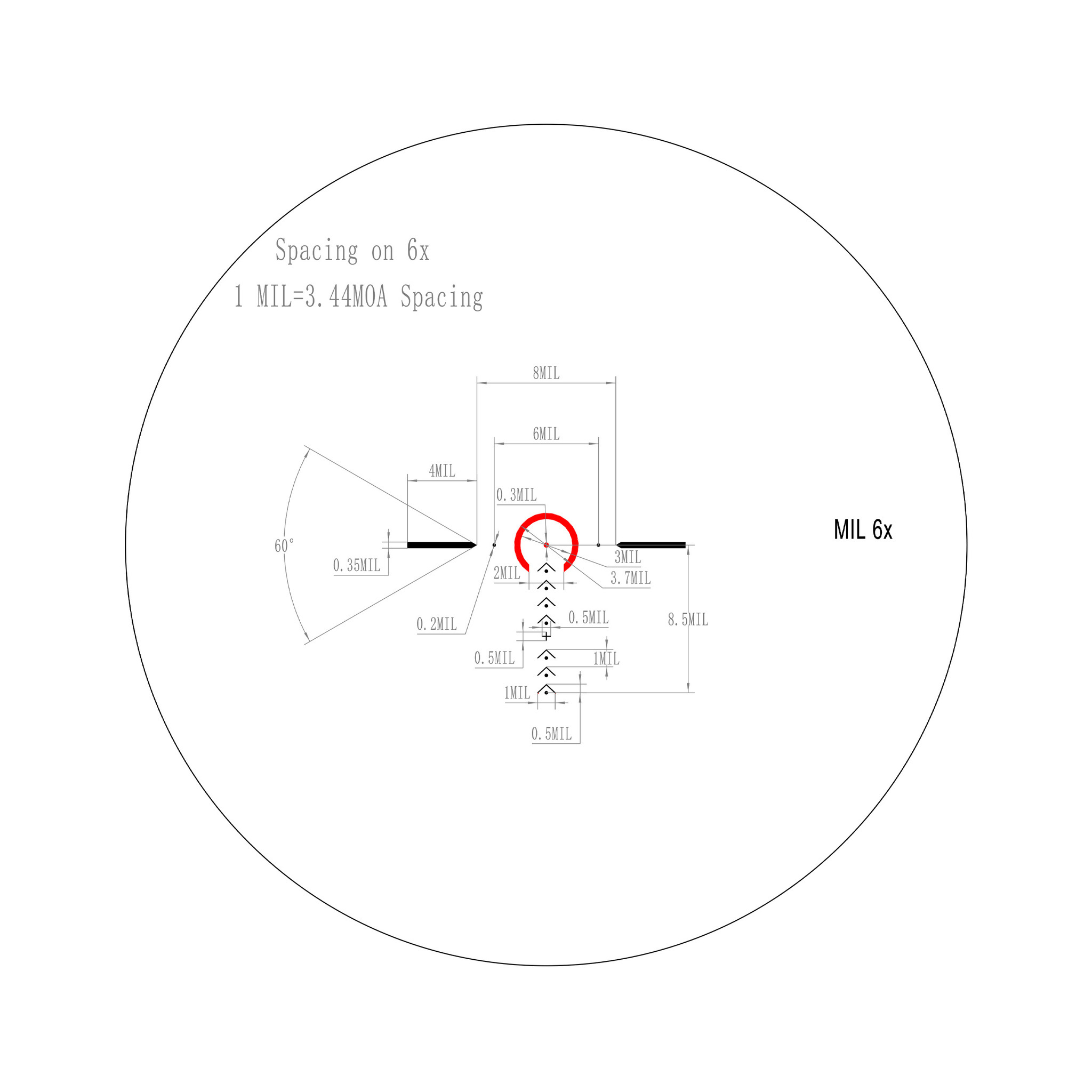 Шкалы механизма ввода поправок отградуированы в MRAD, цена деления 1 клика – 0,2 MRAD. Соответственно поворот шкалы на 1 клик перемещает на 2 см прицельную марку на мишени, удаленной на 100 м.