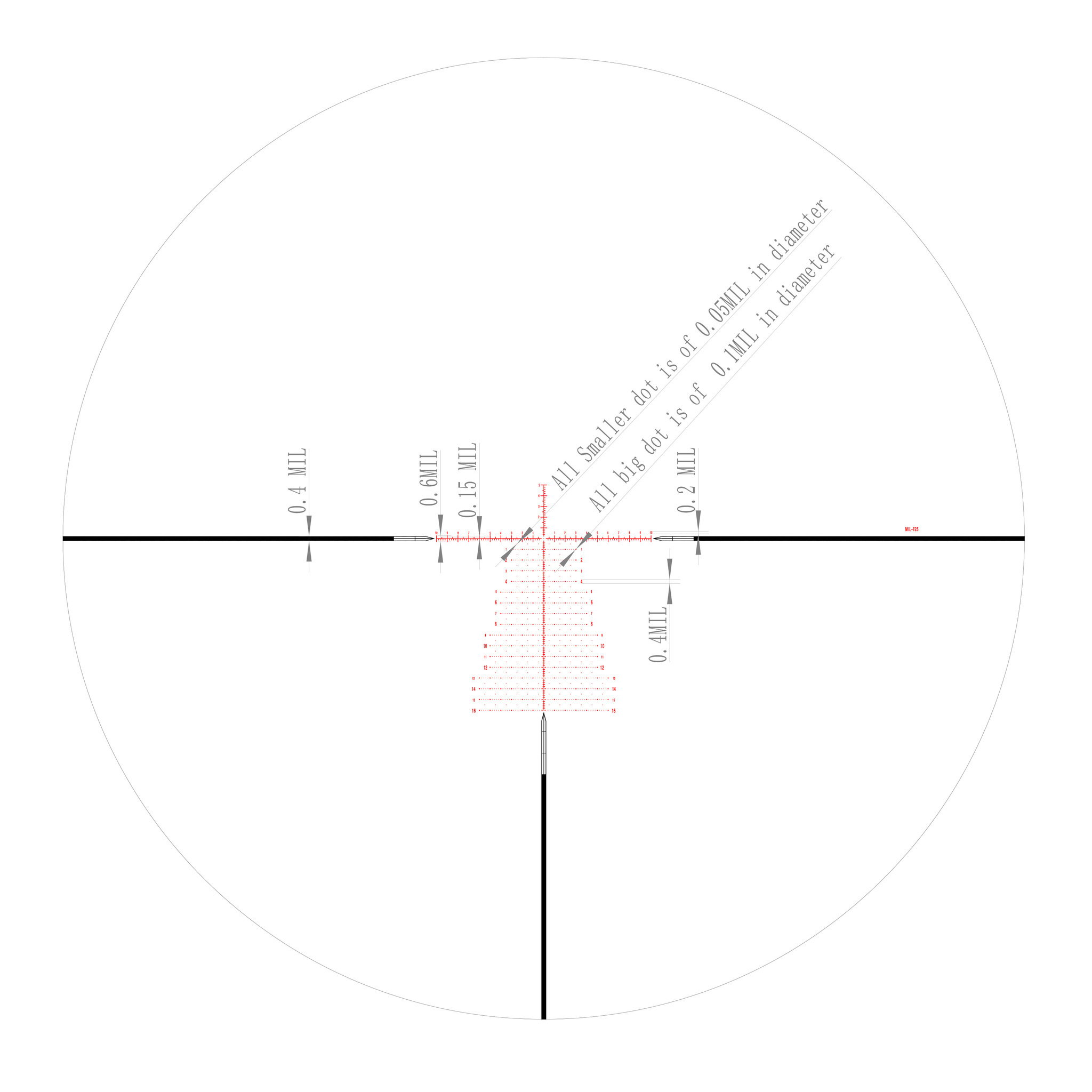 Ниже центра пересечения отмечены точки с шагом 0.2 MIL, при этом размер точек, обозначающих целые миллирадианы, увеличен для ускорения подсчета. Дополнительные метки нанесены с шагом 0.5 MIL. Четные значения MIL под центром чередуются по размеру для удобства подсчета и проверки соответствующих точек удержания цели.