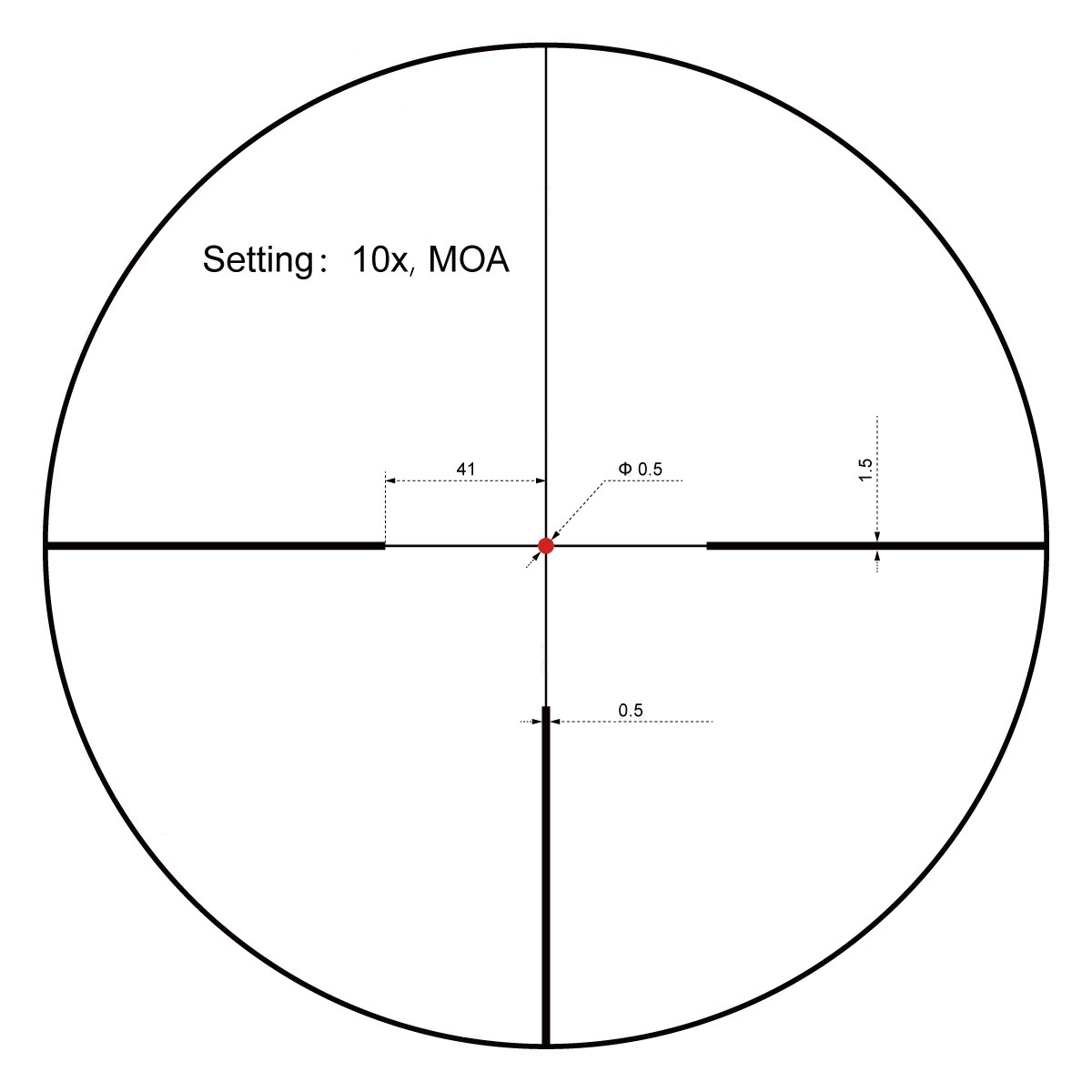 Сетка Fiber center dot или VECNS-G4F (10x, SFP, MOA) — одна из оригинальных модификаций German #4: с тремя тонкими длинными «пеньками» и тонким же перекрестьем с точкой 0,5 MOA. Расстояние от любого «пенька» до центра 41 MOA. Метка чисто охотничья, в фокальной плоскости окуляра (правильные размеры на 10x), без «обвеса» в виде баллистической разметки, с возможностью быстрого прицеливания по точке. Вместо классического LED элемента для подсветки используется красное оптоволокно, как в оптоволоконных мушках. Это позволяет сделать «точку» намного ярче и заметней на свету и в темноте, в особенности в условиях крайне яркой внешней освещённости. Питание обычное, от батарейки, уровней яркости 11, так что и регулировка более плавная, чем у прицелов с 6 уровнями яркости.
