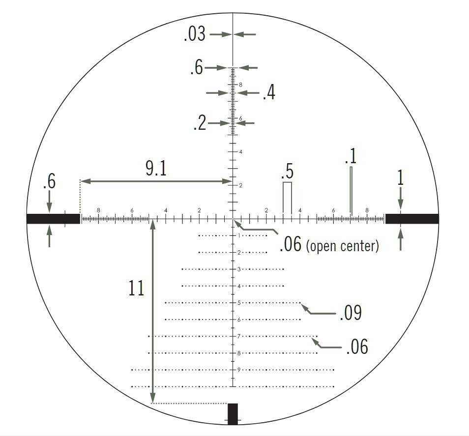 Шкалы механизмов ввода поправок отградуированы в MRAD. Механизмы ввода поправок имеют цену деления (1 клик)=.1MRAD, соответственно поворот шкалы на 1 клик перемещает на 1cм прицельную марку на мишени, удаленной на 100 метров.
