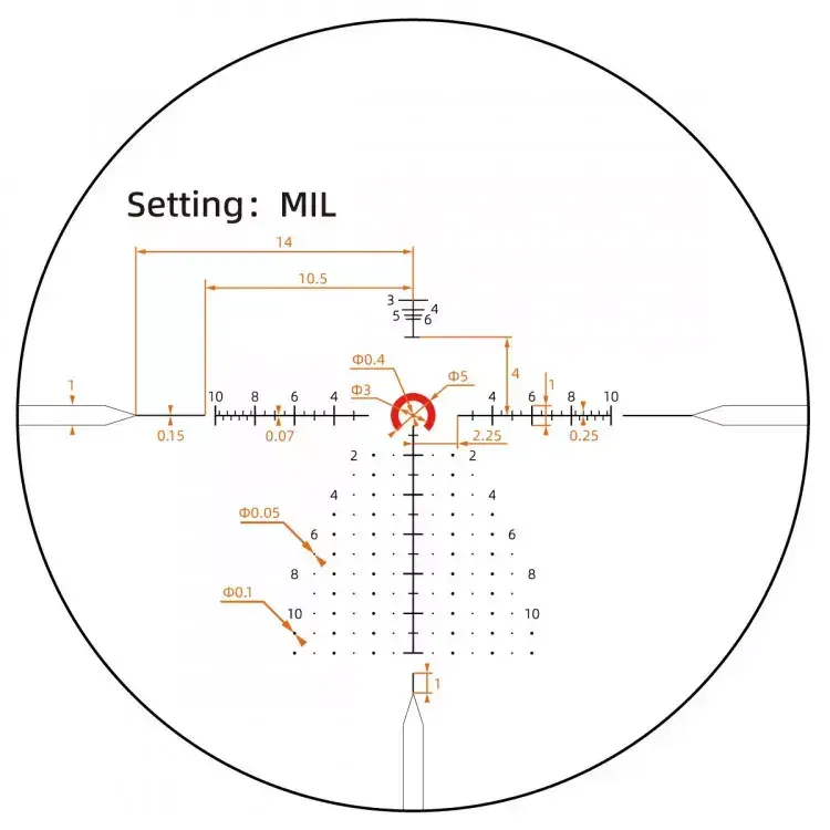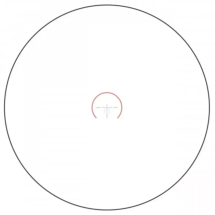 Сетка VCO-2 MIL FFP адаптирована для ближних и средних дистанций. Находится в 1й фокальной плоскости, размечена в MIL — для расчёта верных поправок на любой кратности и в привычных единицах. При 1x видно и «точку» в центре и внешний круг — для быстрого прицеливания. При 10x — центральную часть сетки крупным планом, для чёткой наводки и стрельбы выносом. Центральный элемент (точка в подкове) и внешний круг подсвечиваются красным. 11 уровней яркости позволяют добиться чёткой видимости центра как в тени, так и на ярком солнце.