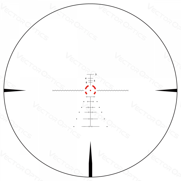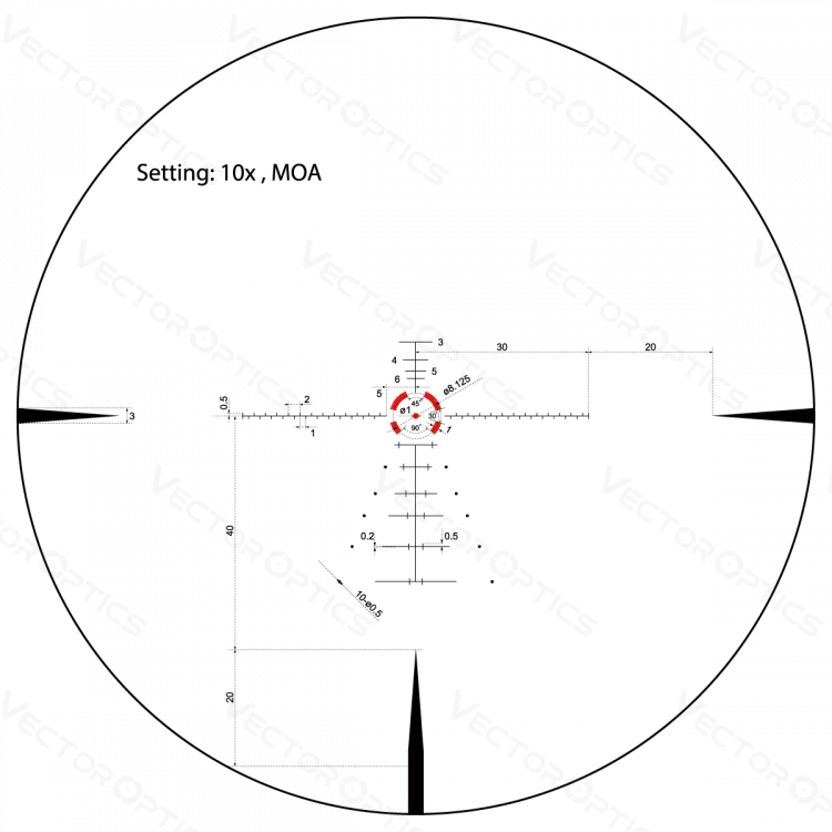 Баллистическая сетка VOS-TMOA (SFP, 10x, MOA) во 2 фокальной плоскости — марка BDC типа, с разметкой в MOA и правильными угловыми размерами для 10x. Центральная часть рассчитана на быструю стрельбу на ближних дистанциях: круг из 4 сегментов (диаметр круга ~ 8 MOA) плюс точка 1 MOA в центре. Для улучшенной видимости при малой освещённости / на тёмном фоне центр можно подсвечивать красным; доступно 11 уровней яркости с выключением подсветки в положении «0». Прицельные «пеньки» сплошные, в виде пик, расстояние между боковыми 100 MOA, от центра до нижнего «пенька» 40 MOA. Горизонтальная направляющая позволяет вносить поправки на ветер /движение, разметка двойная, рисками отмечены каждые 2 MOA. Вертикальная направляющая позволяет вносить поправки на дальность и оценивать расстояние до цели с известными размерами.