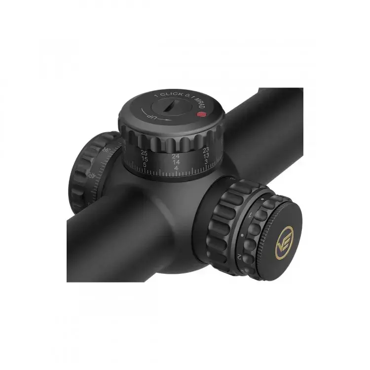 Сетка VCT-34FFP позволяет стрелять выносом и оценивать расстояние до цели с известной высотой. Метка размечена в милах, как и барабаны, выгравирована на стекле (тонкая и долговечная) и находится в фокальной плоскости окуляра (FFP), т. е. меняется только визуально: чем больше кратность, тем крупнее сетка, тем проще использовать разметку. Угловые размеры всегда остаются правильными. Вертикальная «ёлка» выполнена по типу «открытого штриха» из точек размером 0,05 и 0,07 мил с таким же шагом. Перекрестье по типу МилДот: линии размечены короткими и длинными рисками с шагом 0,2 мил, в центре — миниатюрная точка 0,012 мил. Для стрельбы на ярком солнце / при пониженной освещённости можно использовать красную подсветку «точки». Подсветка 6-ступенчатая, с быстрым включением / выключением в промежуточных положениях. Для питания потребуется 1 батарейка CR2032 (покупается отдельно).