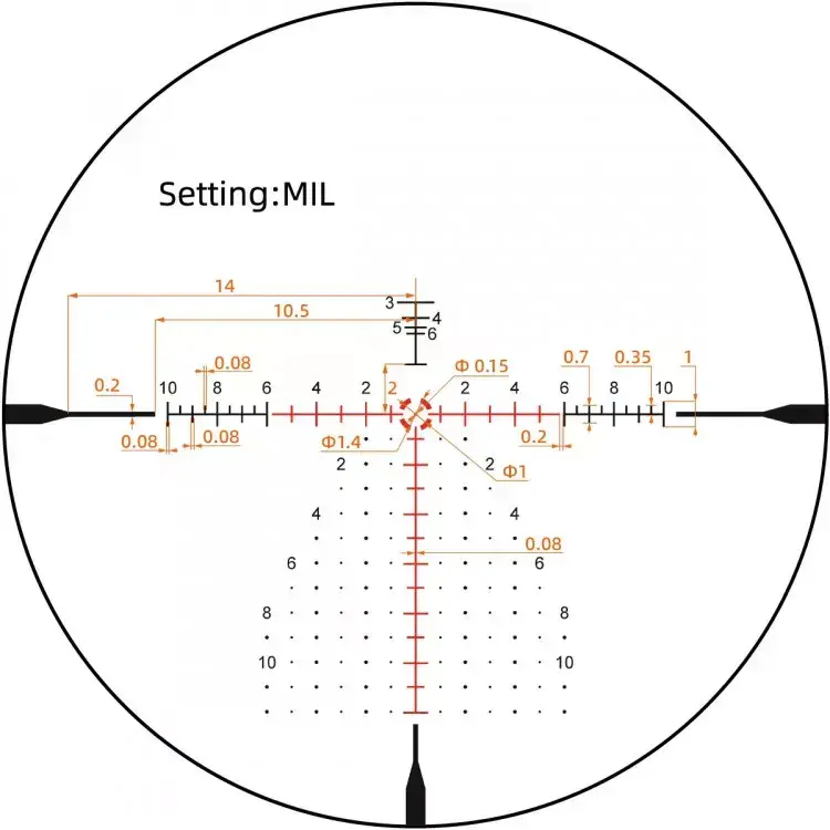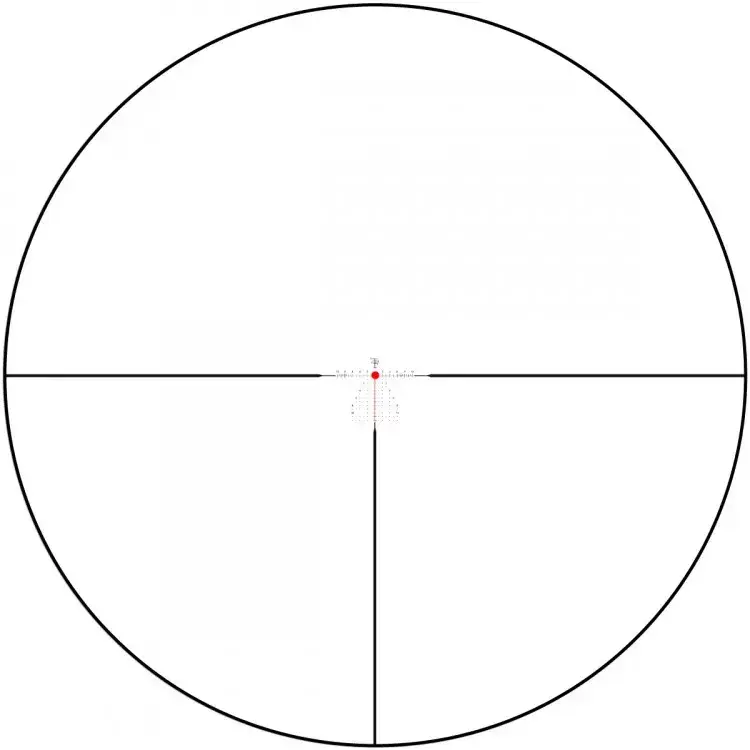 Масштабируемая сетка VET-CTR 2 (FFP Mil) спроектирована с учетом стрельбы на малых и больших расстояниях. Угловые размеры остаются правильными при любой кратности, а тонкая линовка и разметка по типу «открытого прицельного штриха» обзор не перекрывают даже на «максималках». МилДот-перекрестье и вертикальная «ёлка» размечены с шагом 1 mI, позволяют оценить расстояние до мишени, вносить поправки на ветер/дальность и вести стрельбу выносом без использования барабанчиков выверки. Ростовая шкала в верхней части может использоваться для оценки расстояния до мишеней USPSA (45x75 см).