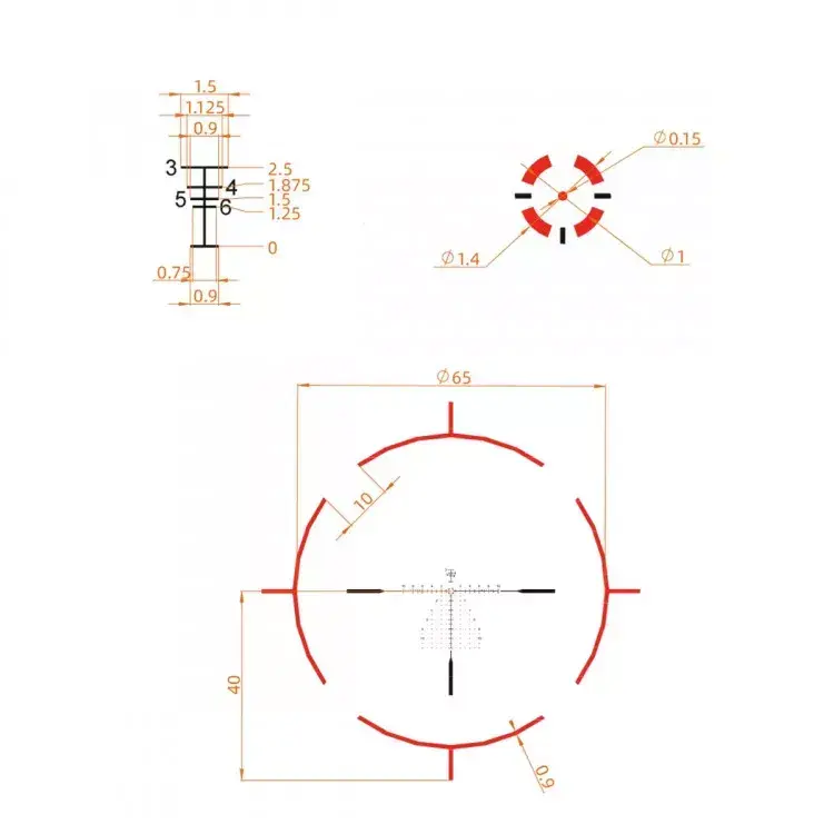 Сетка VET-RAR 2 (FFP, Mil) находится в 1 фокальной плоскости — сохраняет правильные угловые размеры на любой кратности. Сочетает классическую Mil-разметку с вертикальной «ёлкой», позволяя вносить поправки без барабанов и стрелять выносом. Внешний круг RAR (Rapid Acquisition Ring) диаметром 65 Mil состоит из 4 секций по 10 Mil каждая. При 2...6x виден полностью — используется для быстрого наведения на цель при динамической стрельбе на малых дистанциях. При 6x...12x «уходит» из поля зрения — не мешает «читать» перекрестье и стрелять по дальним целям. Ростовая шкала используется для оценки расстояния до мишеней типа USPSA 45 на 75 см.