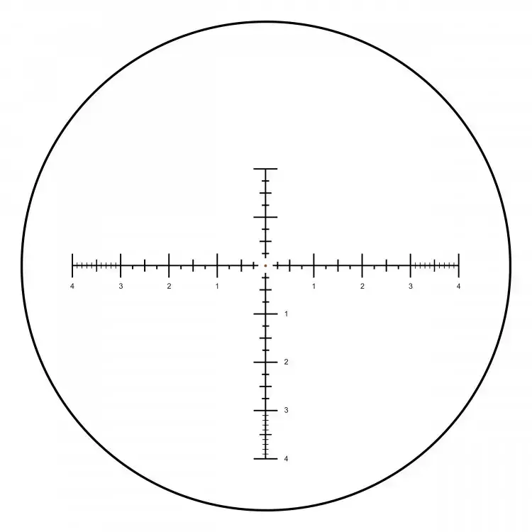 Сетка VCO-5 Mil находится в фокальной плоскости окуляра (SFP), при смене кратности визуально не меняется (не масштабируется), а угловые значения элементов верны при 40x. Конфигурация — типа МилДот, с плавающей» центральной точкой диаметром 0,03 мил. Чёткие линии толщиной 0,01 мил размечены с шагом 0,25 мил (каждый полный мил оцифрован), в диапазоне от 3 до 4 мил — дополнительная разметка с шагом 0,1 мил. Позволяет оценивать дистанции и вносить точные поправки при стрельбе по мишеням и PRS-гонгам.