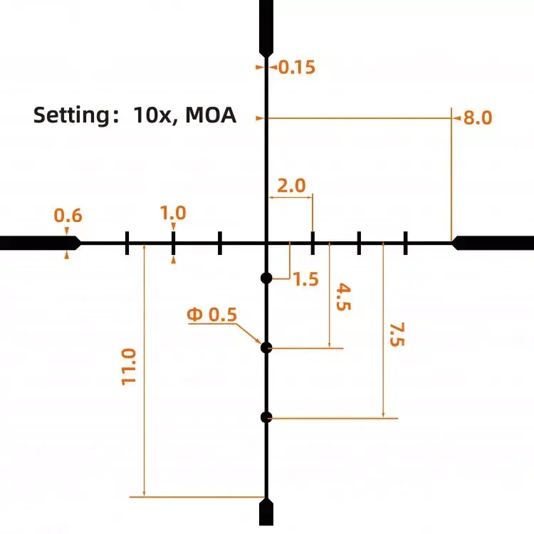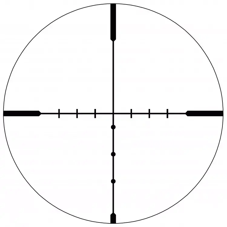 Сетка VOW-10BDC SFP находится в фокальной плоскости окуляра (немасштабиремая), размечена с шагом 2 MOA, откалибрована на 10x. Первоначально разрабатывалась под калибр .223 REM, с учетом компенсации падения пули на дистанциях 200, 300, 450, 550 и 650 ярдов («точки» на вертикальной направляющей). Метка чёткая, тонкая, хорошо заметна в тени и на сложном фоне. Подсветки нет.