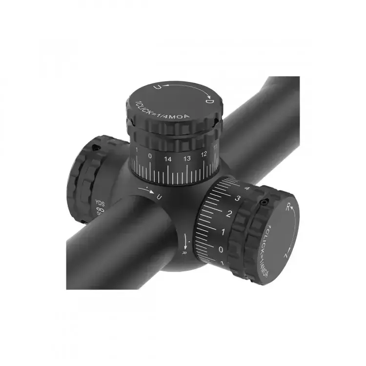 Барабаны выверки тактического типа: открытые, крупные — рассчитаны на руку в перчатке и настройку на холоде / под дождем, с подпружиненной блокировкой — защищены от случайного сбоя настроек. Вращаются с чёткими, различимыми на слух щелчками-кликами. Цена клика классическая — 1⁄4 MOA, диапазон выверки — 40 MOA.