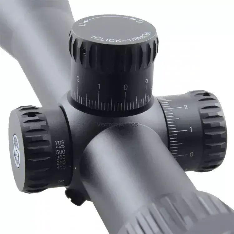 Барабанчики выверки по типу тактических: высокие, без крышек, со счётчиком полных оборотов, боковой оборудован системой блокировки Push-Pull для защиты от случайного смещения и сбоя настроек (чтобы внести поправки, барабан нужно оттянуть вбок до упора). Вертикальный барабан блокировки не имеет, зато оснащён системой Zero-Stop, позволяющей физически фиксировать пристрелянный «ноль». Это облегчает возврат к исходным параметрам пристрелки и позволят избежать ухода в минусовые поправки. Для максимально точной выверки выбран очень небольшой шаг 1/8 MOA ( или 3,6 мм/100 м).