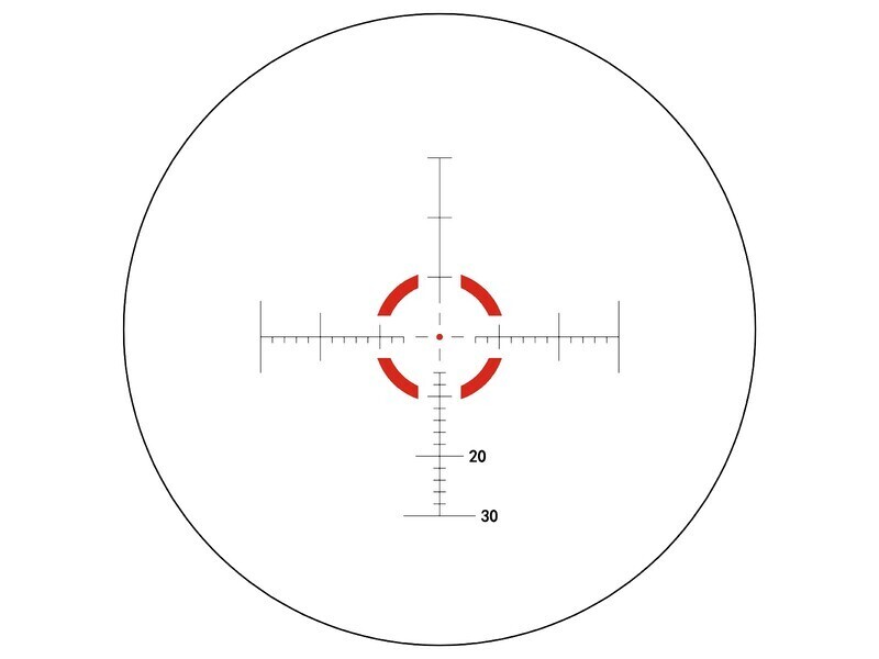 В прицеле использована прицельная сетка на травленом стекле M-4RD, которая является одной из наиболее распространённых для малых дистанций. Сетка расположена в первой фокальной плоскости и изменяет свой масштаб пропорционально кратности. M-4RD представляет собой перекрестие с вертикальной и горизонтальной разметкой, прицельную марку и дополнительную окружность для быстрого захвата цели. Оптический прицел с подсветкой помогает оперативно настроить яркость прицельной марки и подстроить её под освещение окружающей среды. Модель имеет 6 уровней красного подсвечивания. Тусклый режим подходит для сумеречного времени суток, снижая усталость глаз во время длительного наблюдения. Яркие режимы используются в светлое время суток, чтобы дополнительно выделить марку.