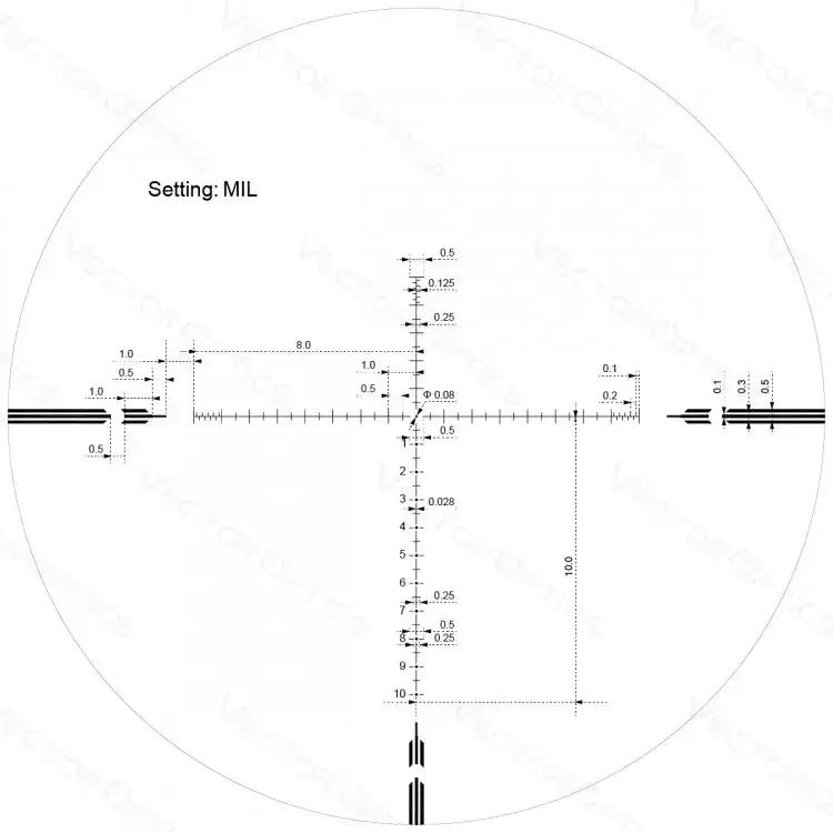 Сетка VOR-4 MIL (FFP) учитывает особенности стрельбы на дальние дистанции без дальномера и калькулятора. Марка находится в фокальной плоскости объектива: чем больше кратность, тем крупнее сетка, угловые величины не меняются. Разметка «Т»-перекрестья по типу Hal Mil-Dot: короткая риска 0,5 MIL, длинная риска 1 MIL, влево и вправо — по 8 MIL, вверх — 5 MIL, вниз — 10 мил с числовыми обозначениями. Идеально для стрельбы выносом и оценки расстояния до цели с известной высотой. Точка 0,08 mil в центре и «круг» диаметром 0,5 MIL — для стрельбы по месту и на дальние дистанции.