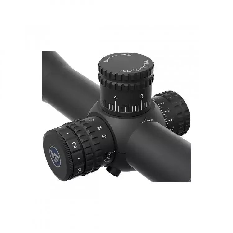 Барабаны тактического типа: высокие, открытые, боковой — с подпружиненной блокировкой от сбоя настроек, верхний — с функцией Zero Stop (Зеро Стоп). Эта функция позволяет быстро и с любой дистанции вернуться к пристрелянной «нулевой» отметке без ухода в отрицательные поправки. Разметка барабанов совпадает с сеткой — в миллирадианах, цена клика = 1/10 MIL. Диапазон выверки по вертикали 30 MIL (300 мм), по горизонтали 16 MIL (160 мм).