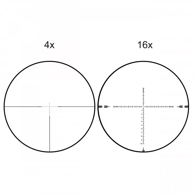 Кратность 4–16×. Боковая отстройка от параллакса — от 10 ярдов. Прицел подходит для стрельбы на дистанциях 10...600 и более метров. На минимальной кратности — широкое поле зрения 5,5 для комфортного поиска и работы на малых дистанциях, при 16× — детальное изображение цели и точное наведение на сильно удалённые объекты. Разметка на барабане отстройки от параллакса обеспечивает быструю фокусировку на 10, 15, 25, 50, 100, 200, 300 или 500 ярдов и может использоваться для предварительной оценки дистанций.
