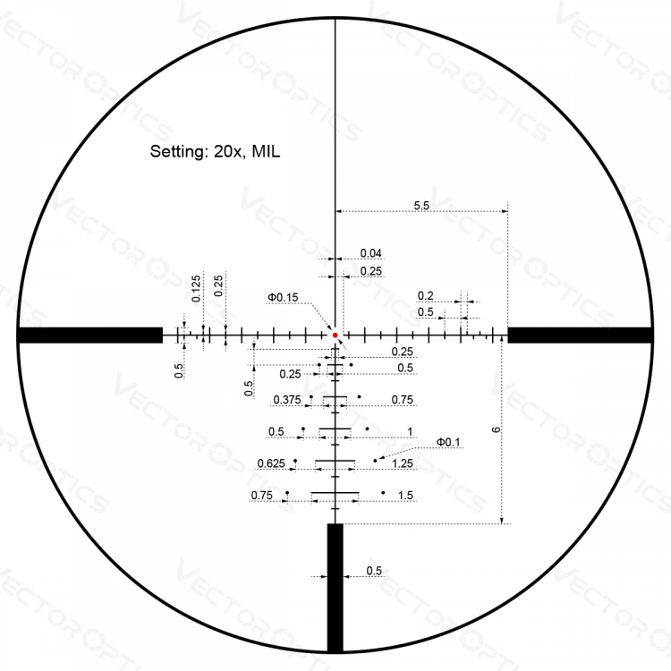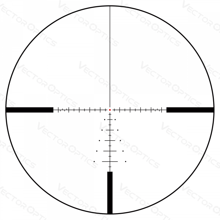 Марка VEPG-TMIL (SFP, 20x, MIL) — BDC сетка с тонким перекрестьем, размеченным с шагом в 1/2 мил по типу Half MiDo, «плавающей» центральной точкой диаметром 0,15 мил и вертикальной «ёлкой» на 6 полных мил. Подходит как быстрого «захвата» и ведения цели, так и для неторопливого выцеливания с учётом разных ветровых и баллистических поправок. Находится на 2-м плане (не маcштабируется, откалибрована на 20 кратах), вытравлена на стекле для большей точности и долговечности. Чтобы улучшить видимость на сложном фоне / в сумерках, а также быстрого привлечения внимания к центру, можно подсвечивать «точку» красным цветом. Подсветка 6-уровневая, с комфортным выключением в промежуточных точках, без прокрутки до «нуля».