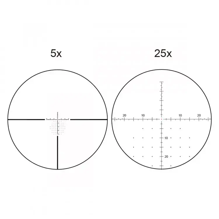 Баллистическая сетка VSE-5 FFP MOA разработана специально для стрельбы выносом на большие дистанции, где точная оценка дальности и бокового сноса имеет решающее значение. Сетка выгравирована на стекле, тонкая и долговечная, разметка — в те же единицах, что и у барабанов выверки. Находится в I фок.плоскости, т.е. при любом увеличении масштаб марки остаётся постоянным относительно размера мишени. При 5x подходит для быстрого наведения по перекрестью: разметка видна в общих чертах, по горизонтали каждые 10 MOA отмечены длинными рисками. При 25x рассчитана на стрельбу выносом: хорошо видно разметку центра — мелкие риски с шагом 2,5 MOA, крупные с шагом 10 MOA и центральную точку 0,2 MOA, а также «ёлку» из точек с шагом 5 MOA (квадратом).