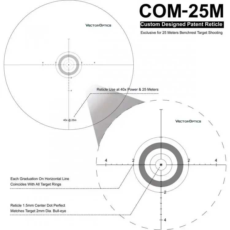 Сетка COM-25M адаптирована для стрельбы на дистанциях 25 м по мишеням для пневматического бенчреста. При 40x разметка направляющих совпадает с кольцами мишени, а центральная точка 1,5 мм точно ложится в «яблочко» (2 мм) — это позволяет наводиться с ювелирной точностью. Марка находится во 2-й фок.плоскости, при смене кратности внешне не меняется, угловые размеры верны при 40 кратах. Для лучшей видимости на ярком солнце и в тени точка в центре подсвечивается красным (11 уровней), с выключением на отметке «0». *Элемент питания CR2032 приобретается отдельно.