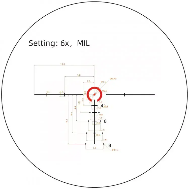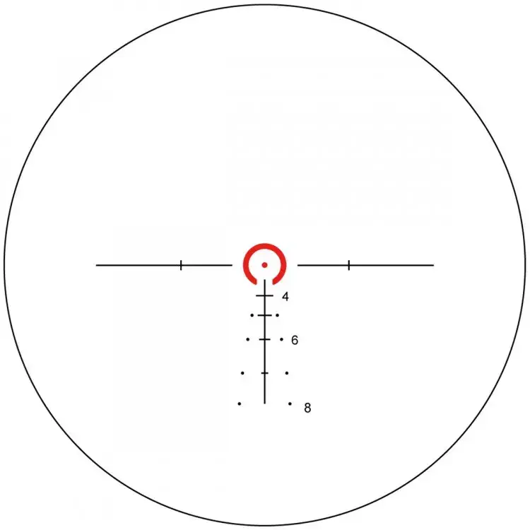 Немасштабируемая баллистическая сетка VTC-SMIL (SFP, 6x, Mil) подходит для стрельбы как по ростовым мишеням, так и по небольшим целям вроде жестяных банок. Вертикальная разметка-ёлочка рассчитана на компенсацию падения пули .223 и .308 Win, позволяет стрелять выносом и оценивать дистанции без дальномера. Центральная подкова с точкой 0,25 Mil быстро ловится глазом, не перекрывает цель при 6x и для лучшей видимости подсвечивается красным. Яркость регулируется под освещение и фон (6 уровней), с выключением в промежуточных точках — удобно для быстрого возврата к нужному режиму. Угловые значения элементов верны при 6x.