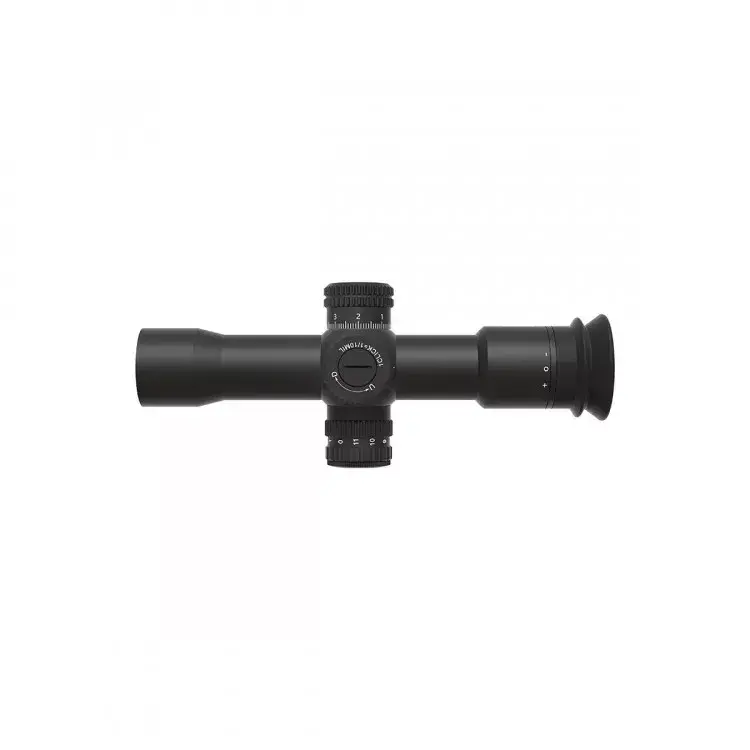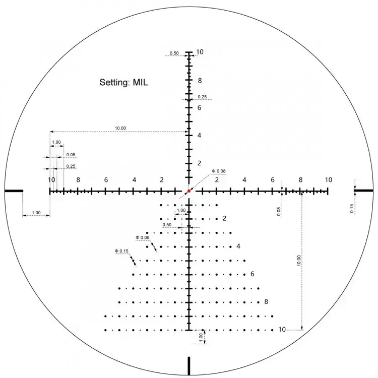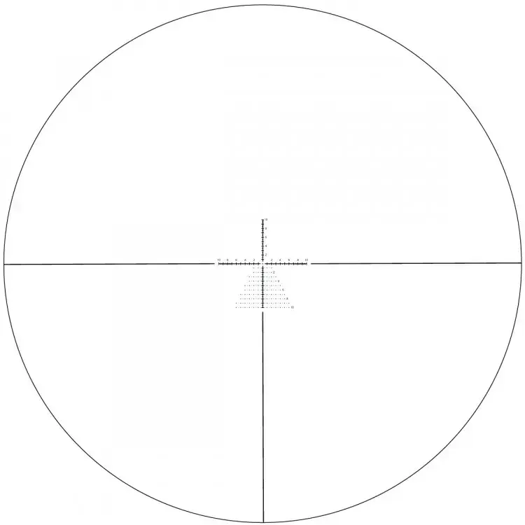 Сетка баллистического типа (mil) с подсветкой позволяет стрелять с выносом точки прицеливания и минимально перекрывает малоразмерные мишени. «Плавающее» перекрестье типа Half MilDot в 2,5 раза шире классического типа: по 10 мил в каждую сторону от центра, разметка с шагом 0,5 мил и числовым обозначением целого мила. Вертикальная «ёлочка» из крупных и мелких точек читается легче сплошной разметки, когда нужна, и не отвлекает глаз, когда не нужна. Аккуратная «плавающая» точка в центре подсвечивается красным для привлечения внимания и лучшего выделения на тёмном фоне. 11 уровней яркости обеспечивают более точную и гибкую настройку под внешнее освещение, чем подсветки с 6 или 8 уровнями яркости.