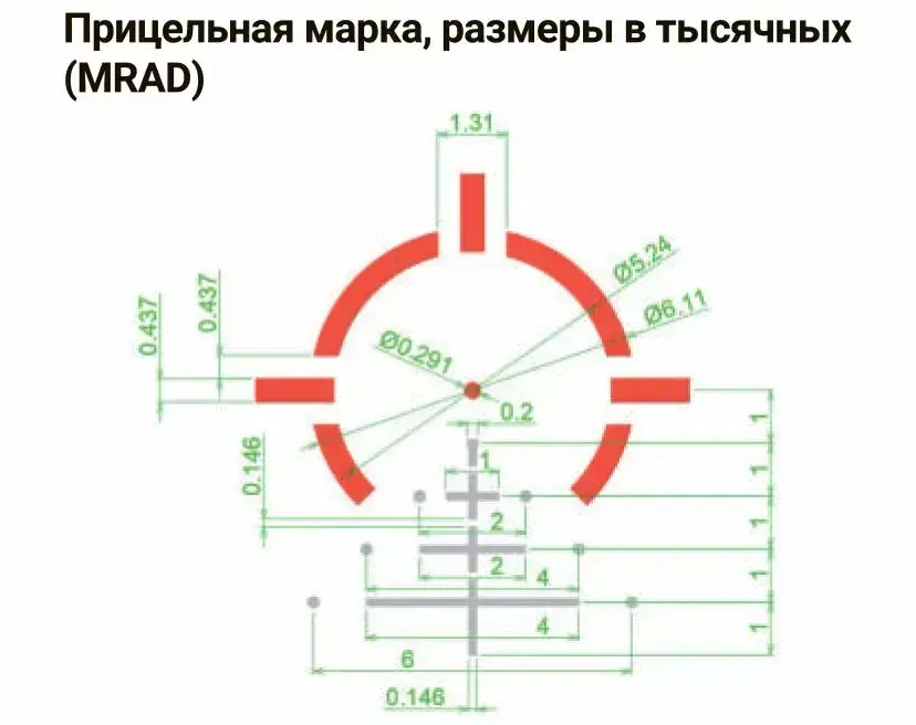 | Количество уровней яркости подсветки прицельной сетки | 8 дневных + 2 ночных |