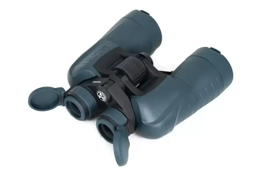 Крышки окуляров и объективов бинокля Arkon 16x50 надежно прикреплены к корпусу при помощи специальных откидных механизмов, что исключает их случайную потерю и обеспечивает защиту линз от повреждений. Во время наблюдений крышки откидываются на корпус, не препятствуя обзору. Для длительных стационарных наблюдений бинокль можно установить на штатив с использованием стандартного L-адаптера под резьбу ¼ дюйма, который в комплект не входит и приобретается отдельно.