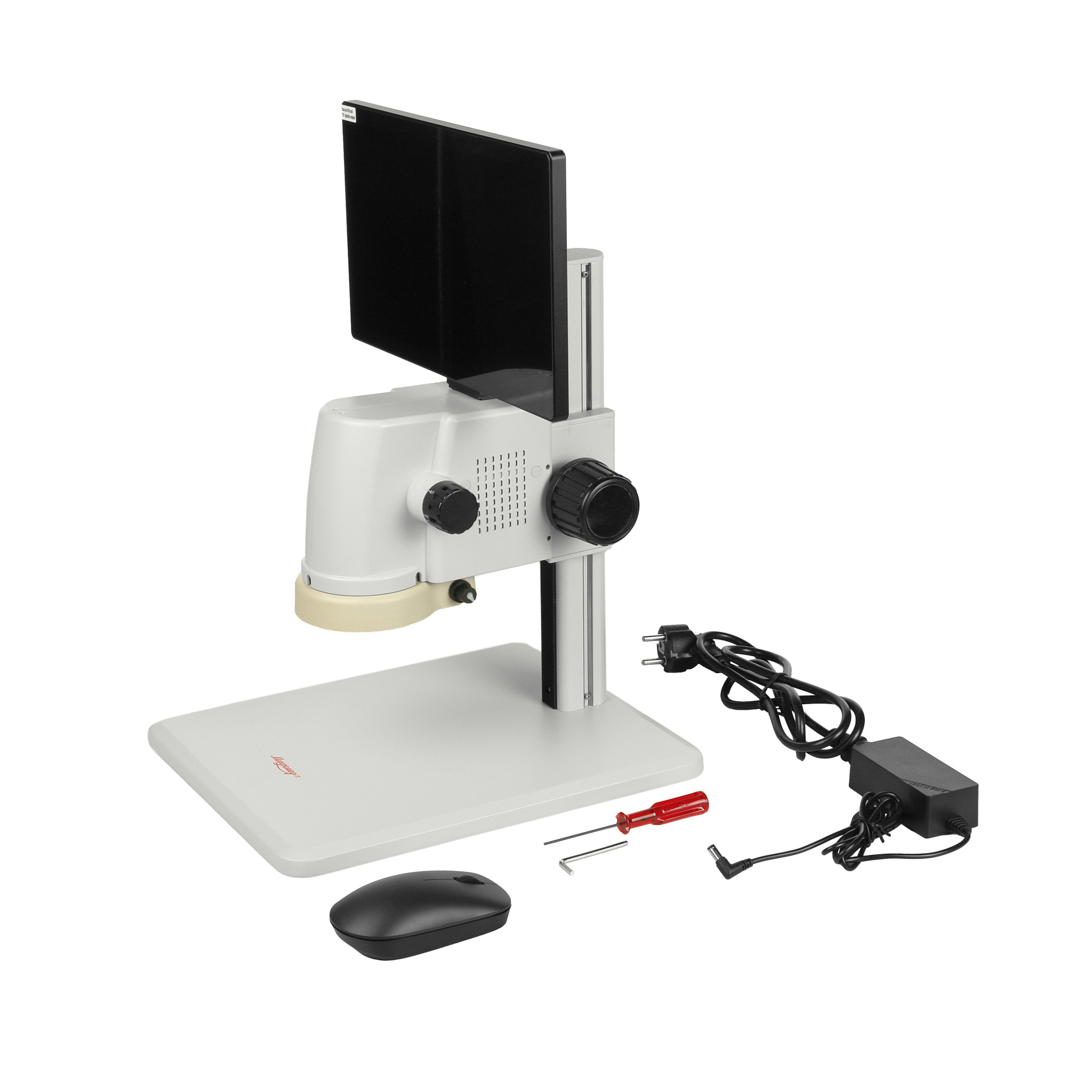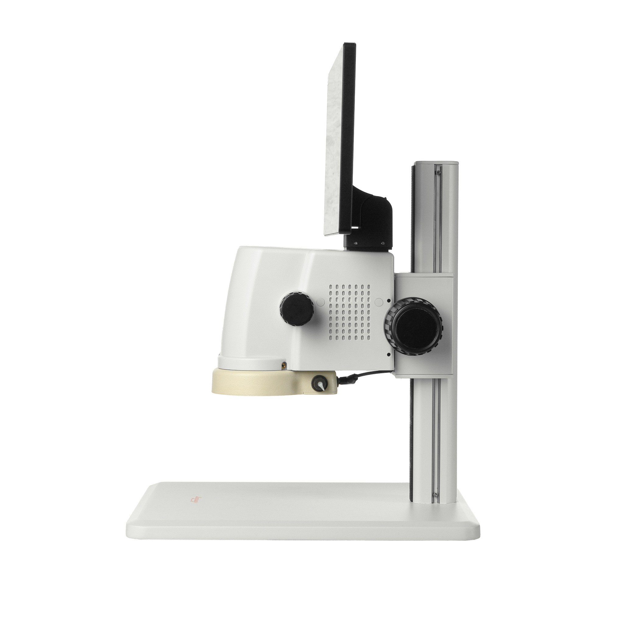 Микроскоп установлен на традиционном штативе с устойчивым металлическим основанием. Прямоугольное основание имеет размер 320 х 260 мм и служит предметным столиком.