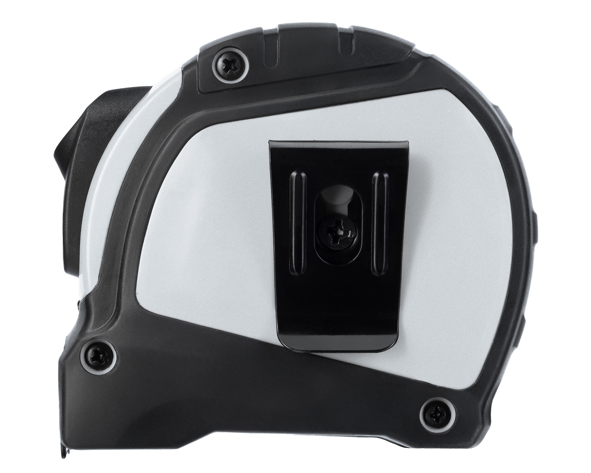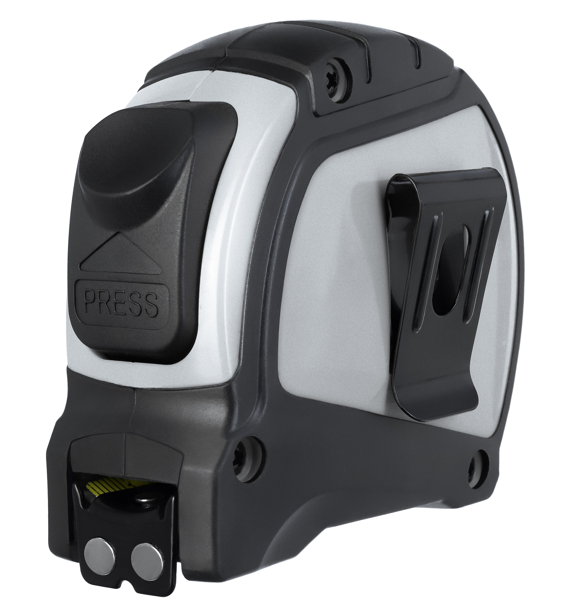 Матовая сталь, из которой изготовлено полотно, не восприимчива к заломам и повреждениям. Корпус из высокопрочного пластика тоже долговечен. Для удобства ношения рулетка имеет поясное крепление.