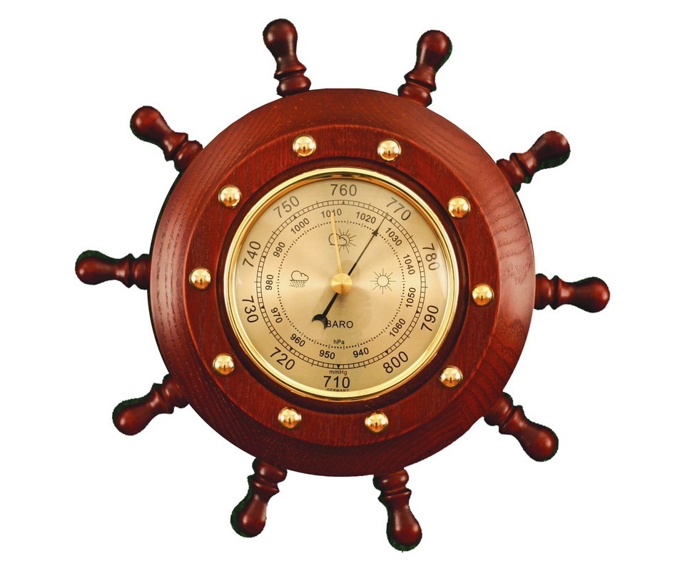 Оригинально оформленный корпус сделан из плотных лиственных пород дерева. Тщательная обработка, подгонка, а также покрытие несколькими слоями лака с тонировкой позволяют использовать прибор в регионах с длительной повышенной влажностью воздуха. Форма 10-ти лучевого штурвала корабля, большой циферблат, видные цифры и пиктограммы выделяют барометр ШБСТ С-5 среди прочих подарков.