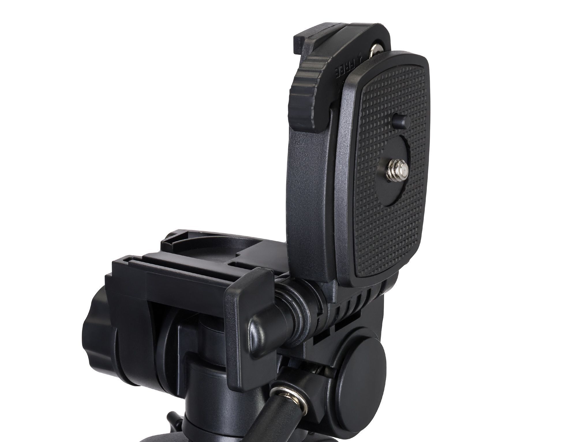 Штативная головка может поворачиваться на 360° по горизонтали, а также вверх и вниз. Для управления ею используется удобная ручка. Установочная площадка сконструирована таким образом, что технику очень легко быстро крепить и снимать. Если ослабить фиксатор площадки, ее можно будет откинуть вбок на угол до 90°. Фиксаторы также есть на горизонтальной и вертикальной осях.