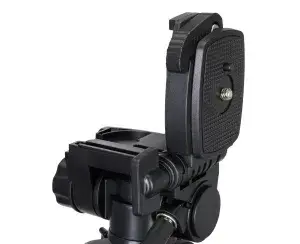Головка штатива поворачивается на 360° в горизонтальной плоскости и наклоняется вперед и назад, а фиксатор может отклоняться вбок на 90°. Это позволит подобрать идеальный угол для фотографирования или выставления света. Головка сделана из ABS-пластика, который более прочен и долговечен по сравнению с обычным. Быстросъемная площадка значительно облегчает фиксацию и смену техники на штативе.
