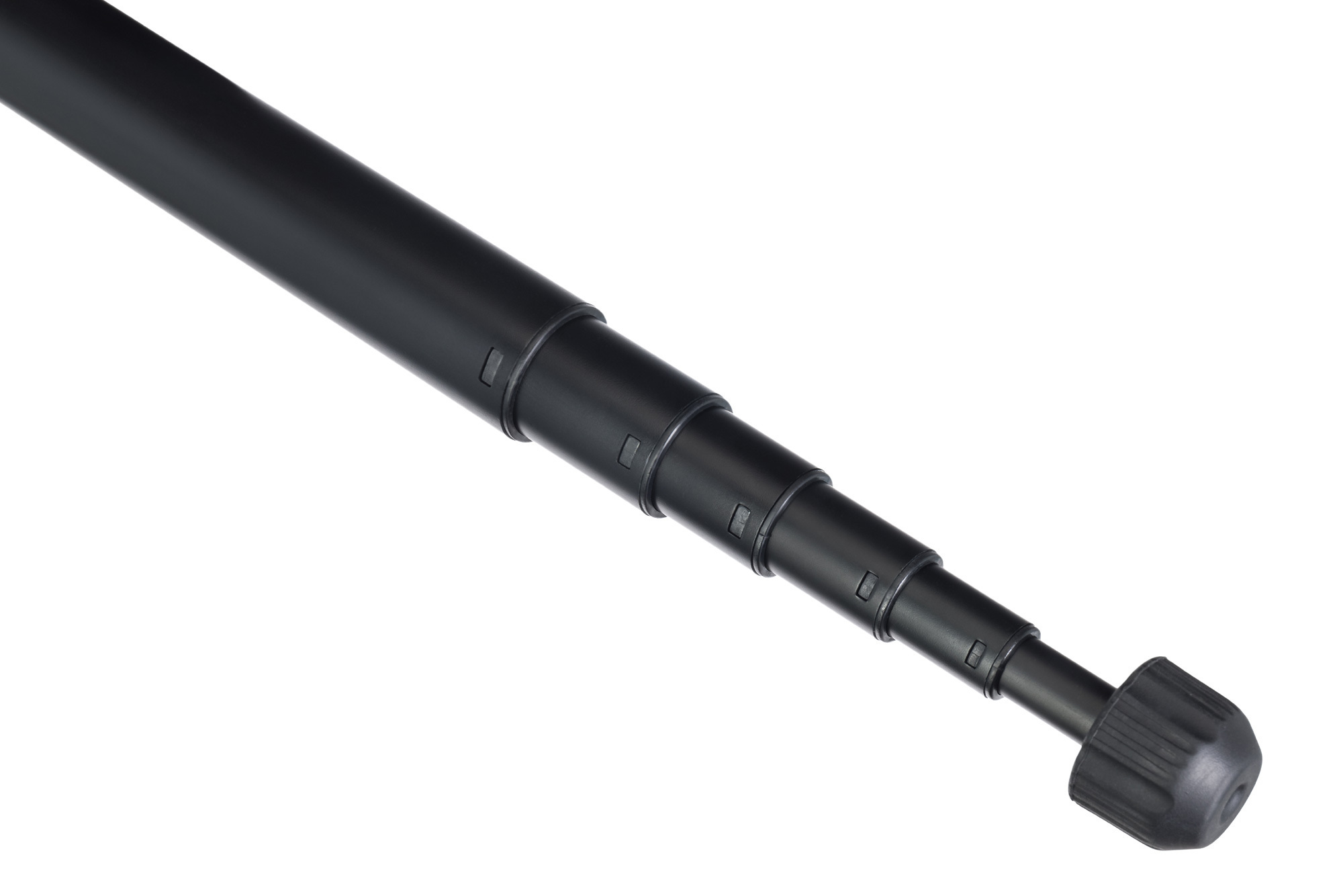 Высота штатива регулируется двумя способами: изменением длины ножек или вертикальным перемещением центральной штанги. Надежные флип-замки гарантируют устойчивость всей конструкции, а крюк для утяжелителя позволит подвесить дополнительный стабилизирующий вес при необходимости. Резиновое покрытие ножек предотвратит скольжение по гладкому полу. Правильность установки можно оценить при помощи встроенного пузырькового уровня.