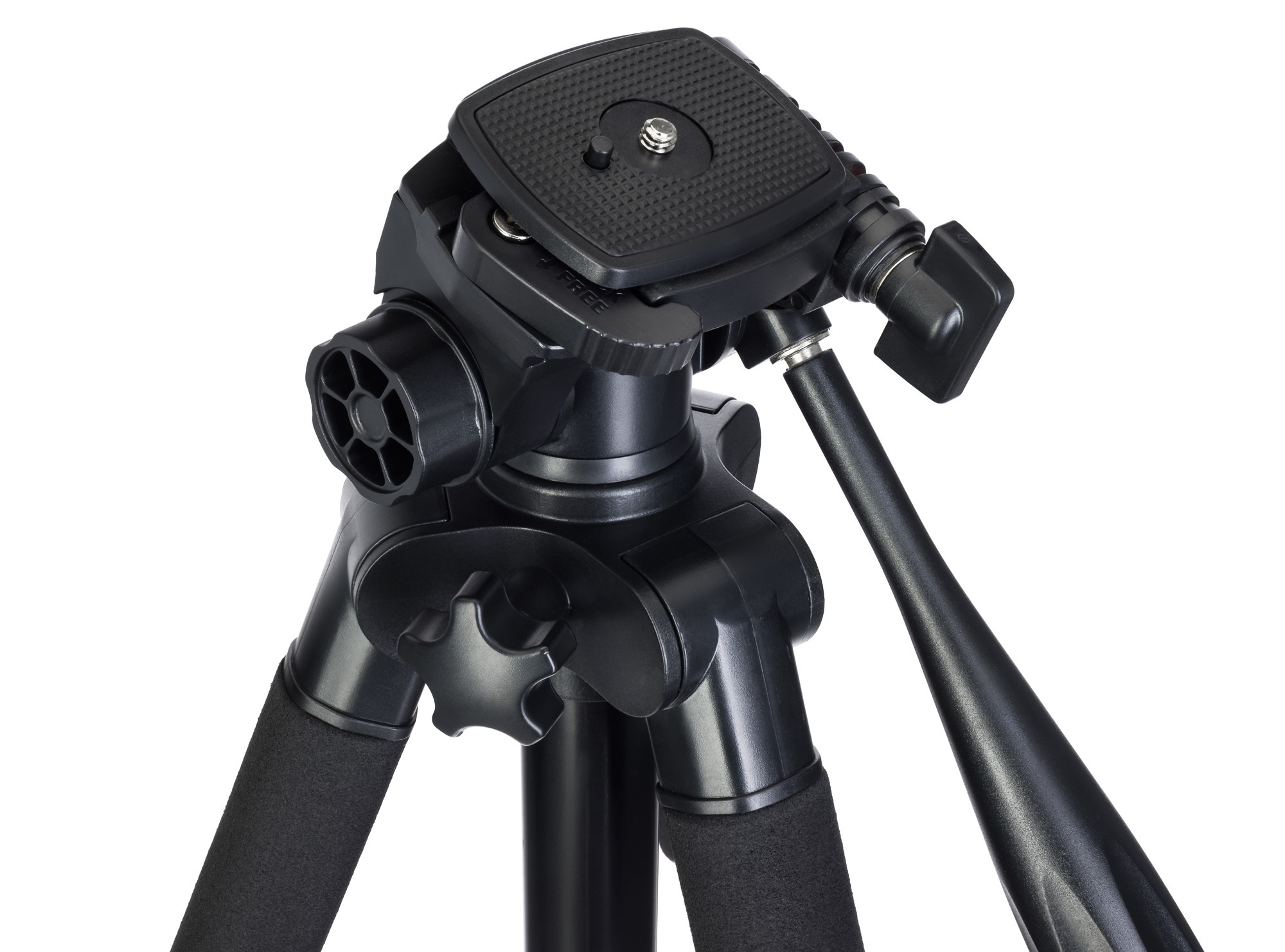 Поворотная головка обеспечит идеальное расположение прибора на штативе: по горизонтали она вращается вокруг себя на 360°, также доступны наклоны вперед и назад, фиксатор отклоняется до 90° вбок. Центральный сегмент штатива можно использовать как отдельный монопод.