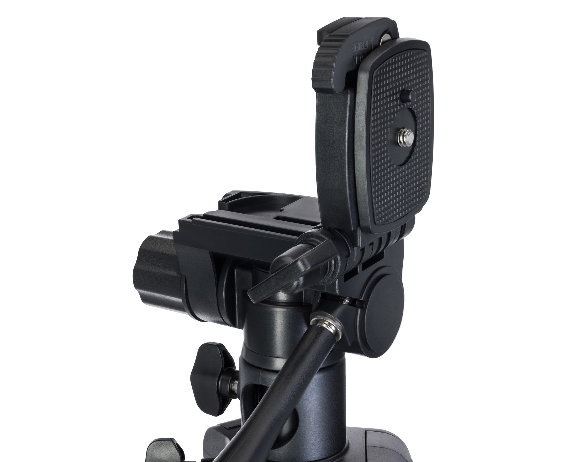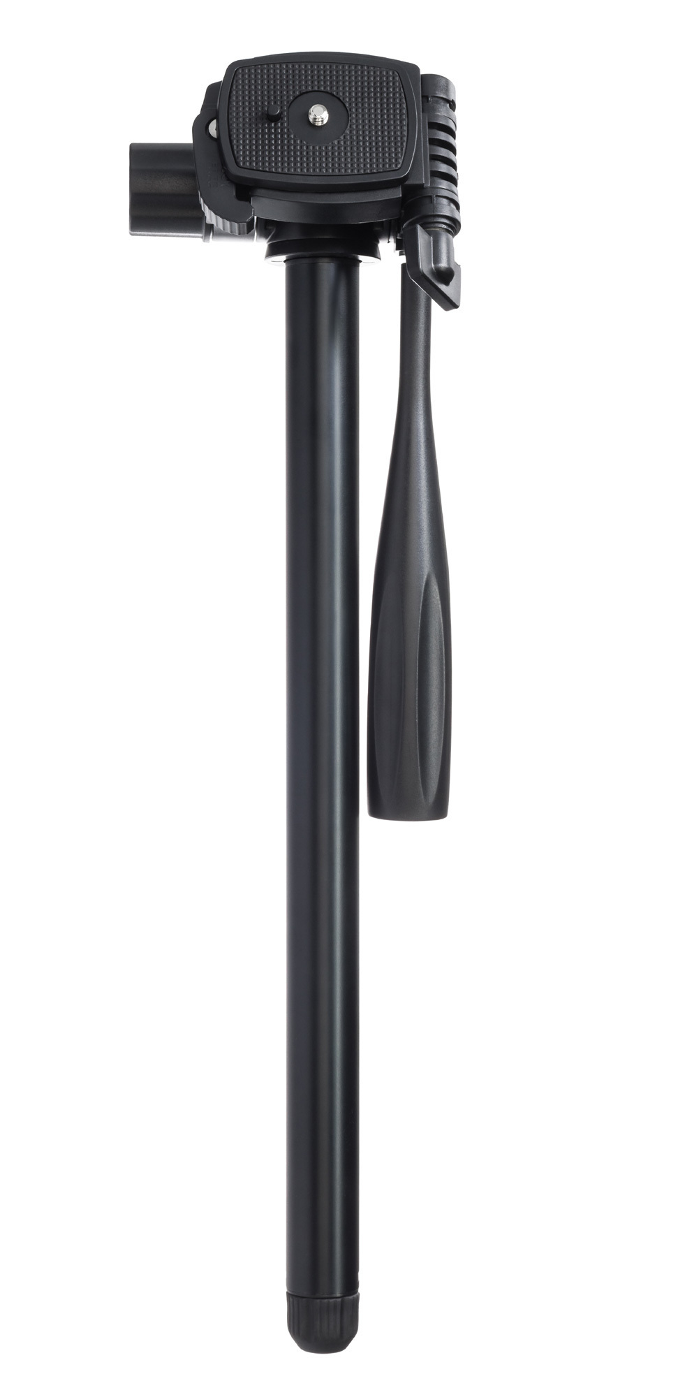 Быстросъемная площадка значительно облегчает процесс смены и фиксации оборудования. Благодаря вращающейся и наклоняемой пластиковой головке и фиксатору, откидывающемуся вбок до 90°, пользователь сможет установить прибор под идеальным для его задач углом. Интересная особенность этой модели состоит в том, что центральный сегмент опоры можно использовать как самостоятельный монопод или горизонтальный держатель для съемки сверху вниз.