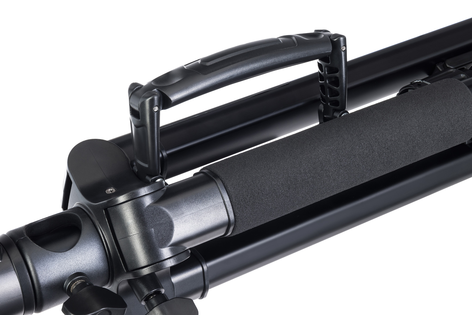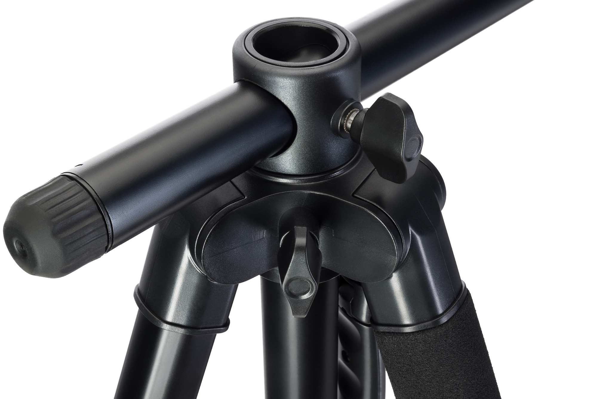 Штатив регулируется по высоте с помощью изменения длины ножек или вертикального движения центрального сегмента. В выбранном положении ножки надежно закрепляются с помощью флип-замков, а так как они обрезинены, штатив не будет скользить даже по гладкому полу, обеспечивая конструкции полную устойчивость. Для дополнительной стабилизации предусмотрен крюк для утяжелителя.