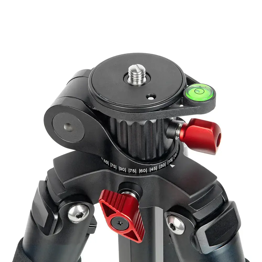 Штатив оборудован двумя пузырьковыми уровнями. Один установлен в основании штатива, а второй на площадке для установки головки. Выставить камеру в горизонтальной плоскости не составит труда. Более того, уровень, установленный в основании площадки имеет возможность вращаться вокруг центральной колонны.
