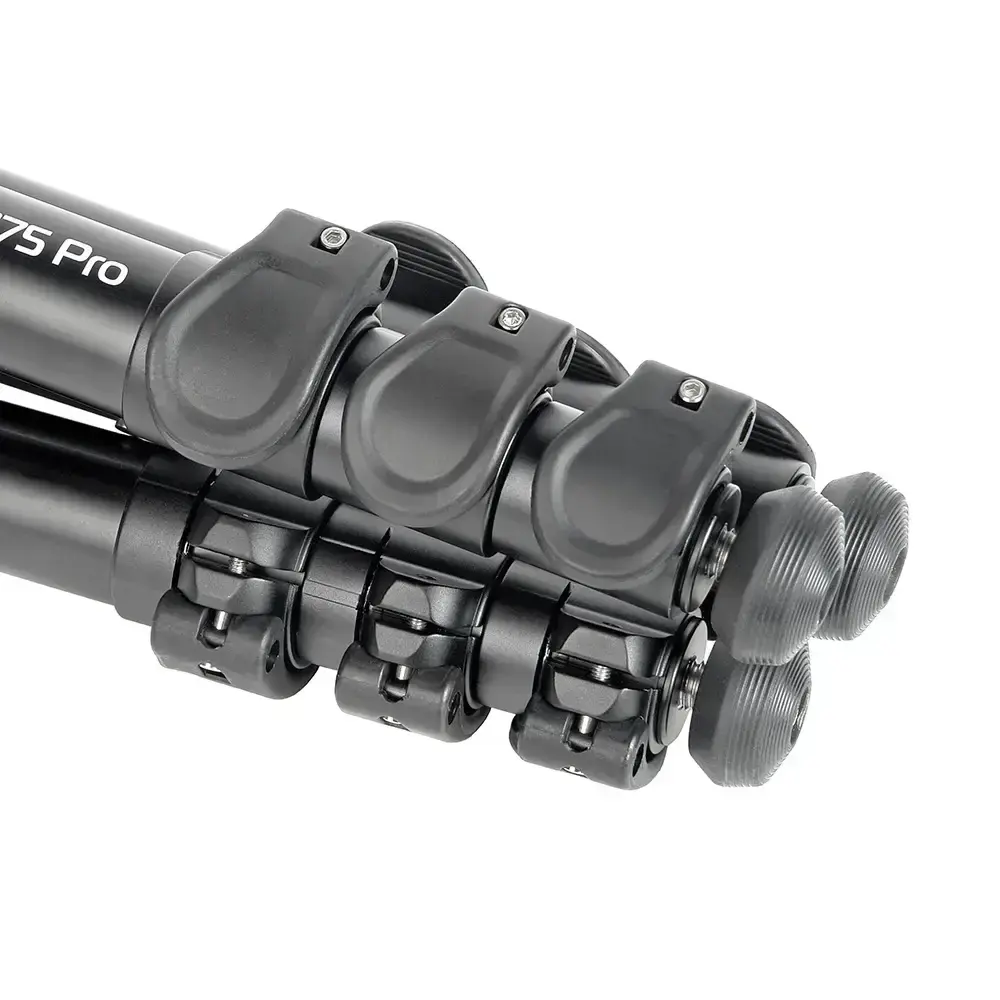 Четыре секции ножек штатива изготовлены из алюминиевого сплава. Анодированное покрытие обеспечивает сопротивление ржавчине, а большой диаметр секций позволяет уменьшить вибрацию. Диаметр ножек штатива — 33, 28, 25 и 22 мм. Секции ног надежно фиксируются клипсовыми замками из ABS пластика. При ослаблении клипсового фиксатора — возможна регулировка зажима винтом.