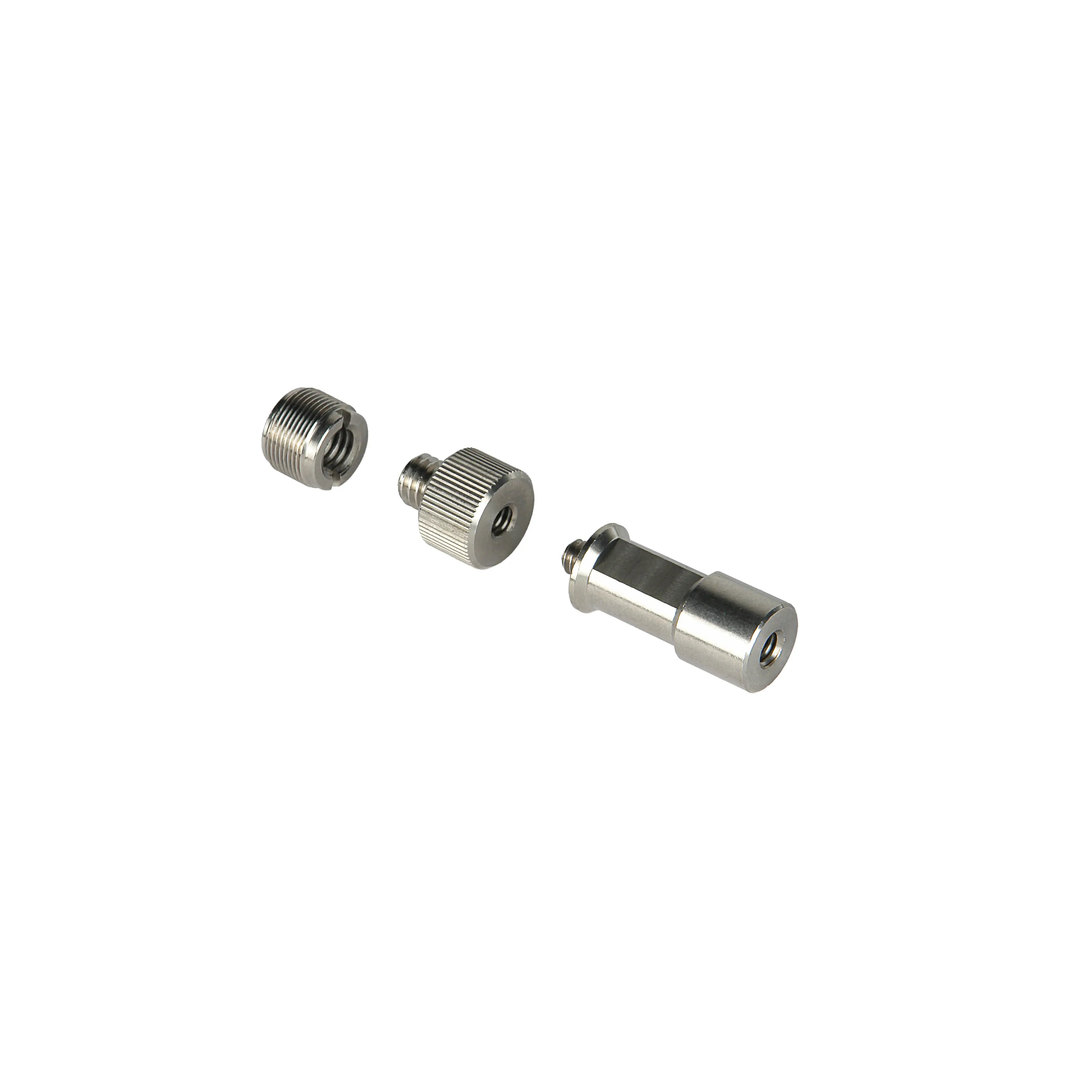 Переходники 1/4" – 3/8" и 1/4" – 5/8" позволят закрепить оборудование с соответствующими резьбовыми отверстиями 3/8" и 5/8" соответственно, такие как микрофонные держатели, клетки, риги и т.д. Штифт 5/8” с резьбой 1/4” превращает держатель в осветительную стойку со стандартным креплением Baby Pin для установки кольцевой лампы или небольшого осветителя.