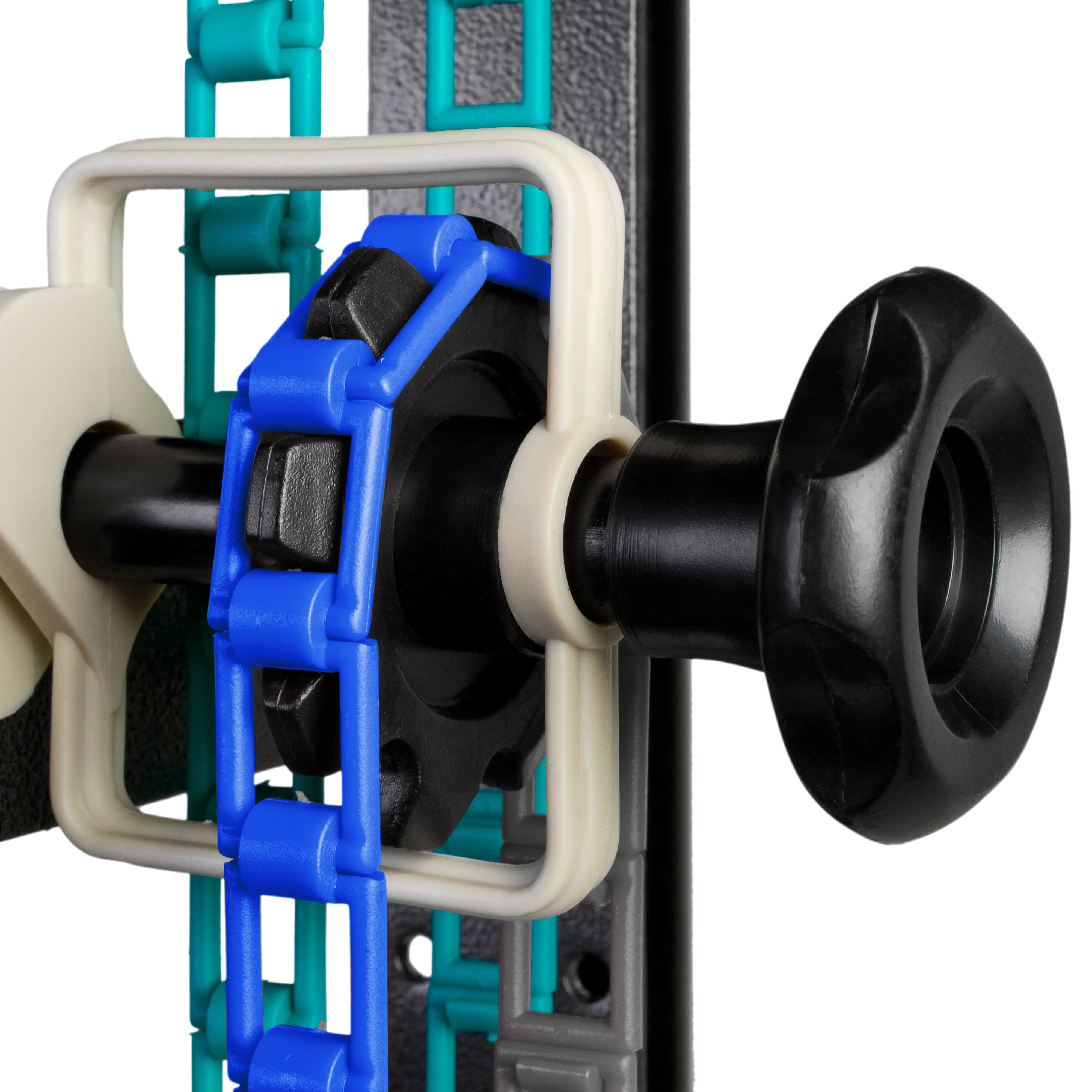 Движение каждого фона осуществляется входящими в комплект роликами с цепями. Рекомендуется для использования с бумажными фонами. Крепление к кронштейнам каждой трубы с намотанным на нее фоном, осуществляется при помощи пары цанговых зажимов, оснащенных ручным приводом для опускания/подъема фона.