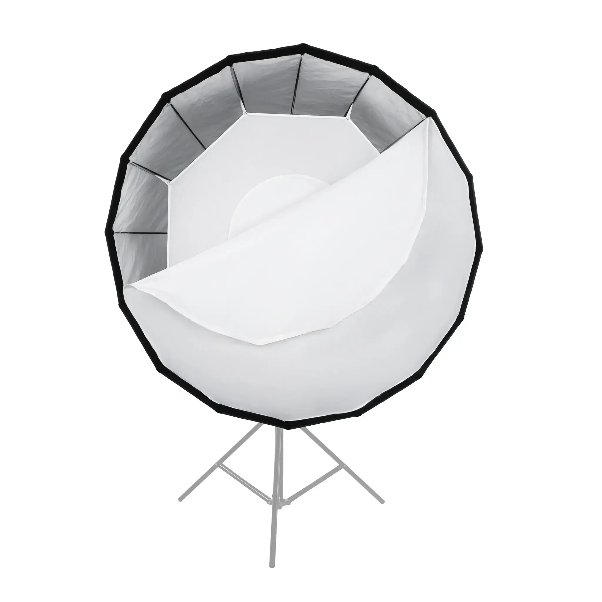Отражатель с серебристой внутренней поверхностью создает равномерную засветку рассеивателя, который, в свою очередь, благодаря большой поверхности, смягчает формируемые тени. Дополнительный внутренний диффузор улучшает равномерность светового потока.